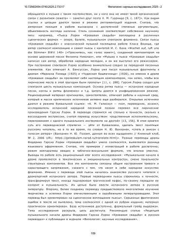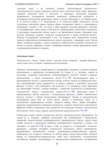 Предметом исследования является восприятие музыкального начала пьесы Федерико Гарсиа Лорки «Кровавая свадьба» (1933) в переводах на русский язык. Объектом исследования послужили текст оригинала пьесы на испанском языке и два его перевода на русский язык (А. В. Февральского, Ф. В. Кельина и Н. Р. Малиновской и А. М. Гелескула). В статье рассматриваются особенности поэтики пьесы, ее музыкальность, черты стилистики фламенко. Приводятся точки зрения исследователей в отношении музыкальности художественного произведения и связи творчества Гарсиа Лорки с народной и классической музыкой. Особое внимание уделяется восприятию музыкального начала, основанного на стилистике фламенко, его значению в пьесе и воссозданию в переводе на русский язык. При проведении исследования был использован метод структурного и мотивного анализа для выявления особенностей структуры пьесы и ее основных мотивов. Использование сравнительно-сопоставительного метода позволило выявить черты стилистики канте хондо, фламенко, народной испанской песни в оригинале и переводах. Основными выводами проведенного исследования являются выявление особенностей восприятия и воссоздания ритмической организации текста в русских переводах А. В. Февральского, Ф. В. Кельина (1939), Н. Р. Малиновской, А. М. Гелескула (2000). Отмечается, что все структурные компоненты драмы связаны общим настроением тревоги и нарастающего напряжения, схожего с тем, что несет в себе народное искусство фламенко. Несмотря на трансформации, смену ритма и тональности, переводчиками, безусловно, воспринято и воссоздано музыкальное начало пьесы и ее фольклорная основа, благодаря чему русская «Кровавая свадьба» сохраняет экспрессивность и яркий испанский колорит. Новизна исследования заключается в том, что впервые была предпринята попытка провести сравнительно-сопоставительный анализ оригинала и переводов пьесы Гарсиа Лорки «Кровавая свадьба» с целью выявления особенностей восприятия музыкального начала в русских переводах в связи с проблемой рецепции поэтики драматургии Лорки и реализацией авторского замысла.