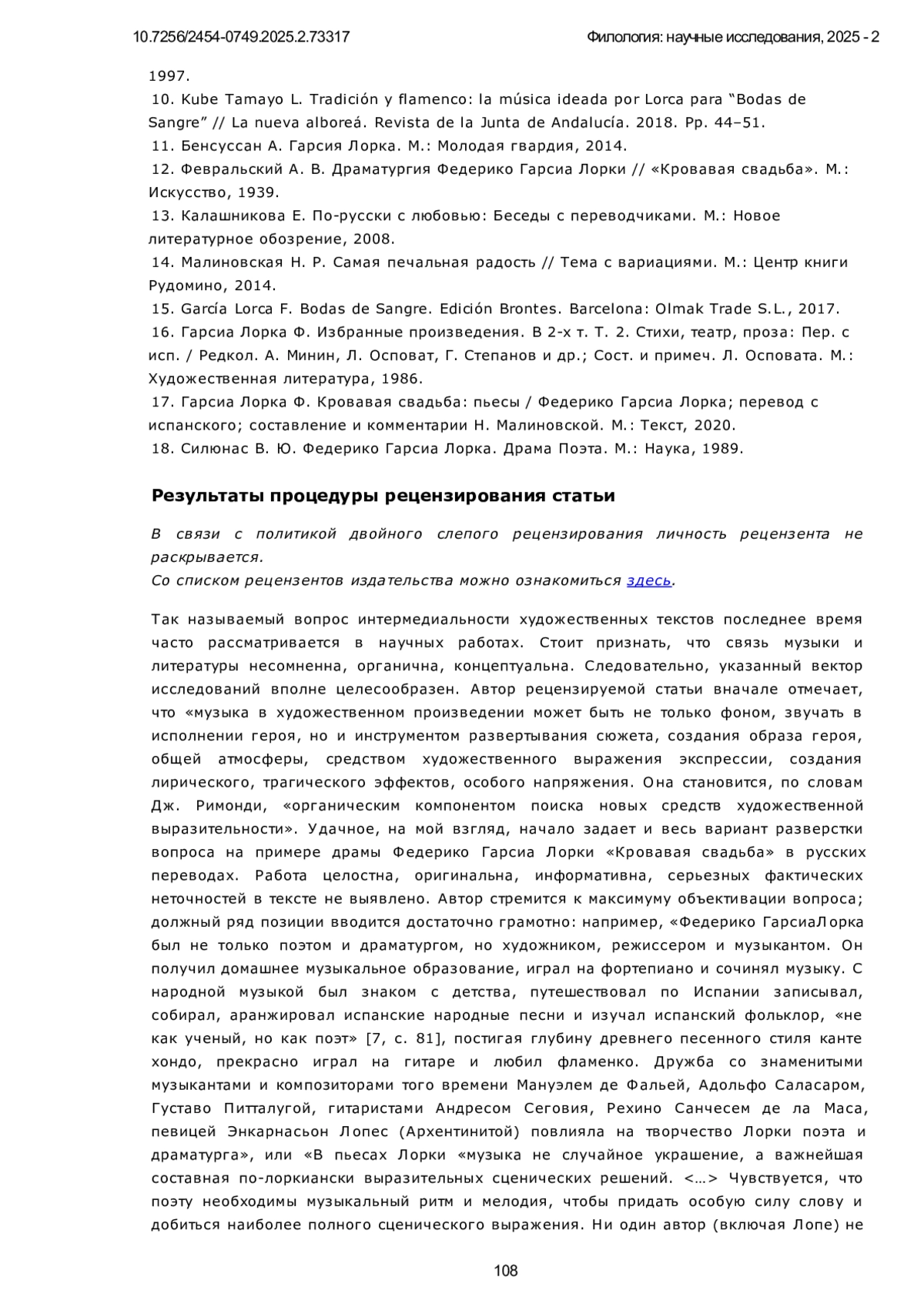 6. Таршис Н. А. Музыка драматического спектакля. СПб.: Издательство СПбГАТИ, 2010. 7. Гарсиа Лорка Ф. Самая печальная радость: перевод с исп. / Сост., автор предисл. и коммент. Н. Р. Малиновская. М.: Прогресс, 1987.