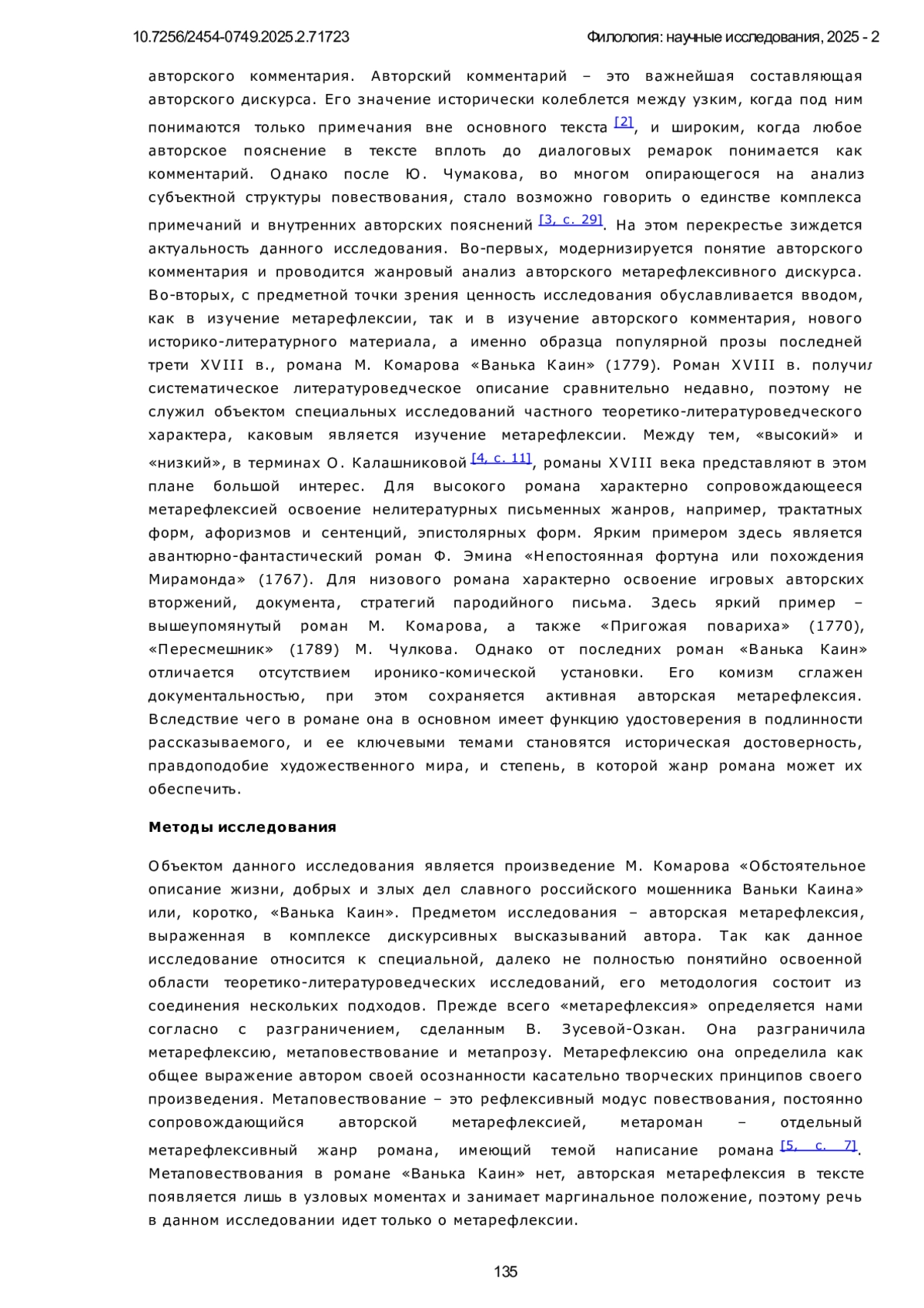 Предметом исследования является авторский метафикциональный дискурс, выраженный в комплексе дискурсивных элементов, имеющий разную жанровую и функциональную природу. В романе Матвея Комарова “Ванька Каин” метаралефлексия представляет комплекс, в который входят металепсисы, отступления, обобщения, глоссы, но также элементы паратекста, например “Предуведомление”, и метатекста, например, подстраничные примечания. Все эти элементы находятся в уникальной конфигурации, составляют единую систему авторского дискурса и отражают метапоэтику произведения. Поэтому анализируя их как систему, мы разделяем не отдельные элементы, а два их комплекса, отражающих ключевую ценностную оппозицию метапоэтики произведения: метафикциональный и метанарративный авторские дискурсы. Первый тематизирует работу вымысла, фантазии. Второй сосредоточен на рефлексии литературной и риторической формы. В романе Комарова они имеют собственную специфику, свойственную риторическому сознанию, модифицированному народной традицией лубочной литературы. В исследовании мы пользуемся телеологическим подходом, выработанным в отечественной филологии А. Скафтымовым. Вслед за Ю. Чумаковым мы включаем авторские примечания в текст произведения. На основе постклассической немецкой нарратологии мы разделяем метафикциональный и метанарративный авторские комментарии. На основе систематизации Ж. Женеттом транстекстуальных связей выделяем гипертекстуальную и интертекстуальную связи данного романа. Новизна исследования заключается в рассмотрении авторской метапоэтики в раннем творчестве Матвея Комарова. В аналитическом выделении ее эксплицитного, вербализованного автором вида, в комментарии, что ранее не становилось предметом исследования. Это потребовало методологически инновативного совмещения перспектив имманентного анализа литературного произведения и нарратологического анализа авторского, в ходе которого стало возможно выделение двух, метанарративной и метафикциональной, системы авторских суждений в тексте. При этом за счет специфики предмета особо ценными результатами исследования стало выявление особенностей литературного сознания Матвея Комарова. Концептуализация им литературности как качества формы, риторического восприятия вымысла как приема. И, напротив, опоры на свидетельство и на опыт в сюжетном оформлении истории, понимание ее природы как отражения действительности, эмблематическое видение ее как фрагмента, имеющего дидактическую ценность.