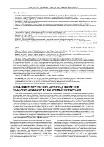В ходе бурного развития нейронных сетей и больших языковых моделей, которое привело к новой технологической революции, стремительно меняются все сферы нашей жизни, включая образование. Развитие искусственного интеллекта ставит новые задачи, связанные с влиянием технологий на рынок труда, необходимостью переквалификации кадров, решения этических вопросов, изменения подходов к обучению. Искусственный интеллект не заменяет преподавателя, но повышает производительность и эффективность его работы, позволяет автоматизировать простые рутинные задачи и освобождает время для решения наиболее важных вопросов, личного взаимодействия со студентами, повышения их мотивации. Авторы представляют результаты исследования на основе принципов системного, деятельностного и аксиологического подходов, проведённого в 2023 и 2024 годах в МГИМО МИД России, в ходе которого была изучена научная литература по теме, дан анализ современных инструментов искусственного интеллекта, используемых в образовании, а также организован онлайн опрос студентов и преподавателей и полуструктурированные интервью с педагогами, реализующими образовательные программы при помощи инструментов искусственного интеллекта. Студенты и преподаватели выразили своё отношение к нейросетям и готовность к использованию инструментов искусственного интеллекта в образовательном процессе. Дан анализ причин, препятствующих использованию нейронных сетей в образовании, и факторов, способствующих внедрению новых технологий. Также авторы предлагают способы использования потенциала искусственного интеллекта в современном иноязычном образовании для повышения цифровой грамотности студентов, их обучения использованию искусственного интеллекта как инструмента для решения задач в будущей профессиональной деятельности и подготовки специалистов, отвечающих требованиям современной цифровой экономики. Авторы оценили риски применения нейросетей в учебном процессе и предложили меры по их минимизации.