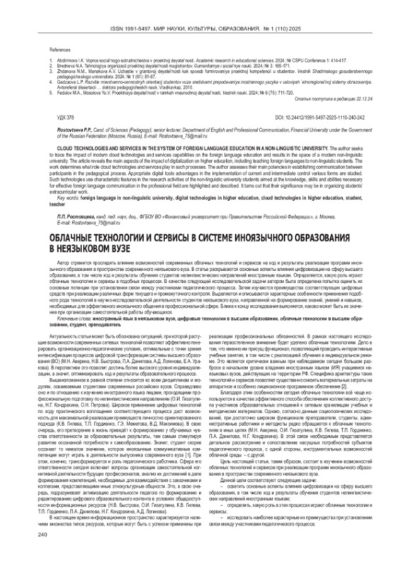 Автор стремится проследить влияние возможностей современных облачных технологий и сервисов на ход и результаты реализации программ иноязычного образования в пространстве современного неязыкового вуза. В статье раскрываются основные аспекты влияния цифровизации на сферу высшего образования, в том числе ход и результаты обучения студентов нелингвистических направлений иностранным языкам. Определяется, какую роль играют облачные технологии и сервисы в подобных процессах. В качестве следующей исследовательской задачи автором была определена попытка оценить их основные потенции при установлении связи между участниками педагогического процесса. Затем изучаются преимущества соответствующих цифровых средств при реализации различных форм текущего и промежуточного контроля. Выделяются и описываются характерные особенности применения подобного рода технологий в научно-исследовательской деятельности студентов неязыкового вуза, направленной на формирование знаний, умений и навыков, необходимых для эффективного иноязычного общения в профессиональной сфере. Ближе к концу исследования выясняется, каково может быть их значение при организации самостоятельной работы обучающихся.