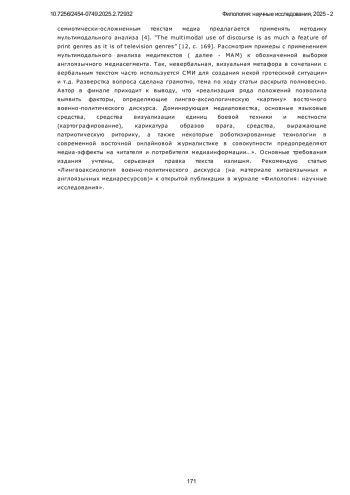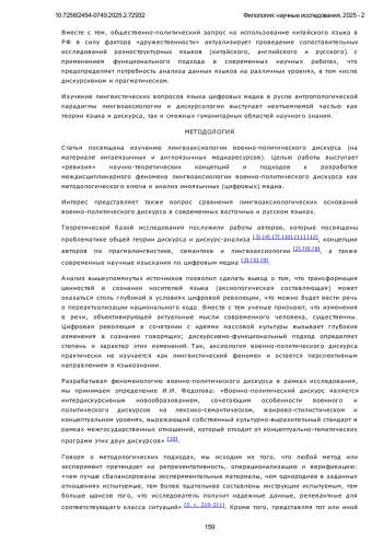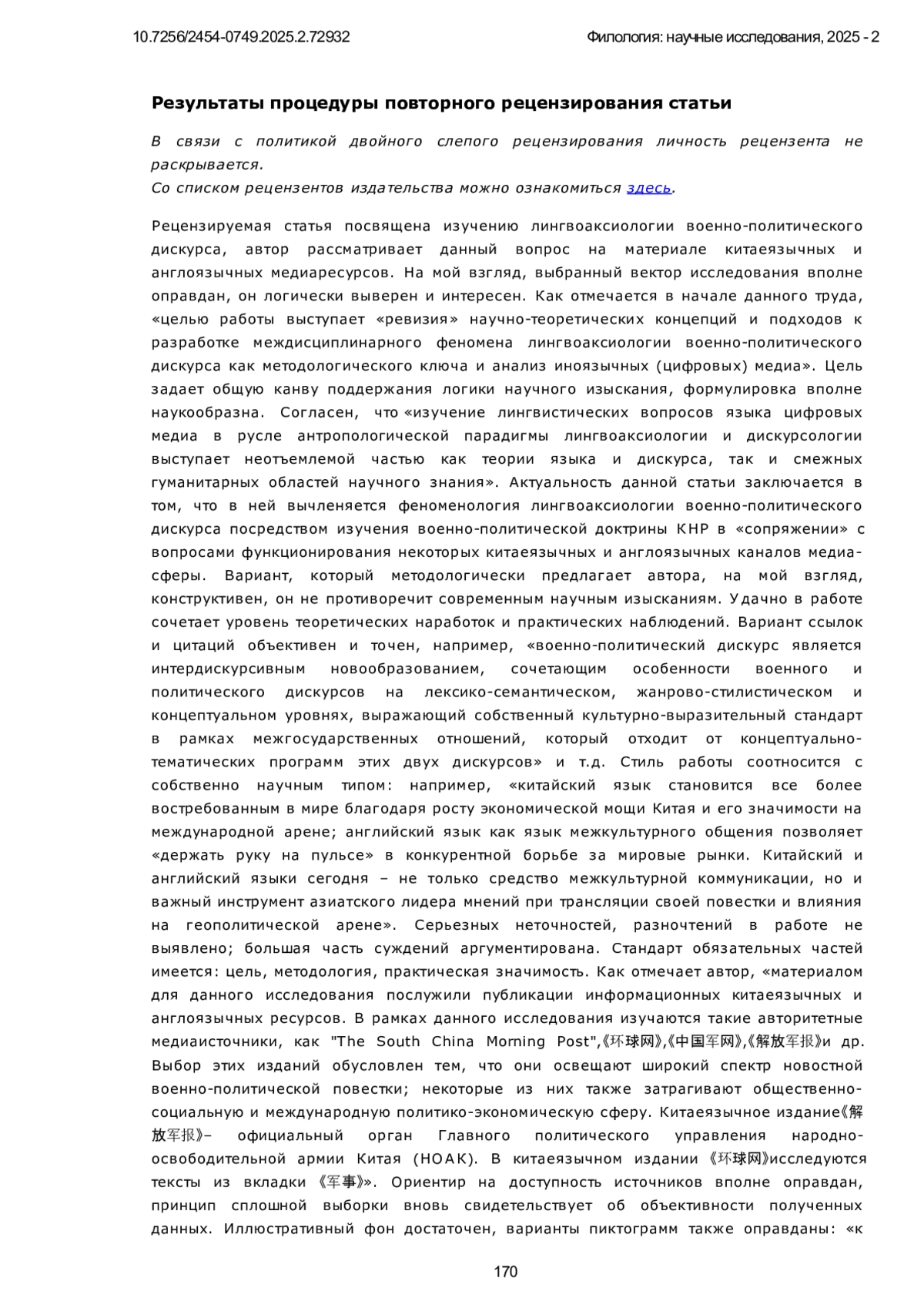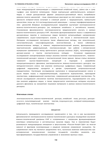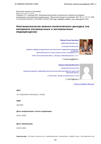 Сегодня процессам цифровизации подвержен любой язык (английский как язык международной коммуникации и современный китайский язык), равно как и сама «цифра» уже является метаязыком. Новая виртуальная действительность интернет-медиа и новый дискурсивный формат (визуально-дисплейный текст) потребовали ревизии многих ценностей - язык стремительно реагирует на этот запрос его носителей. Ценности интернет-эпохи вступают в сложный диалог с традиционными, привычными ценностями эпохи до 4-й постиндустриальной революции - налицо переформатирование этих ценностей. Впервые исследовательским предметом выступают лингвоаксиология военно-политического дискурса (на материале китайского и английского языков). Становление феноменологии лингвоаксиологии предполагается изучать в рамках военно-политического дискурса КНР. Изучение функционирования языка и современных дискурсивных практик в иноязычных медиа является актуальнейшим направлением современного социо-гуманитарного знания, в том числе и лингвистической науки. Методами исследования послужили такие общенаучные методы, как описательный, сопоставительный, классификационный, количественный, а также собственно лингвистические методы, а именно: медиалингвистический анализ, функционально-прагматический, дефиниционный, лингвокультурный; при работе с эмпирическим материалом применяется метод критического дискурс-анализа (КДА), мультимодальный дискурс-анализ и группа лингвистических методов. Основное содержание исследования сконцентрировано вокруг анализа понятий «лингвоаксиология», «военно-политический дискурс» именно с лингвистической точки зрения. Целью статьи является «ревизия» научно-теоретических концепций и подходов к разработке междисциплинарного феномена лингвоаксиологии военно-политического дискурса как методологического ключа при анализе иноязычных (цифровых) медиа. Современный цифровой медиасектор находится в центре гуманитарной антропологической парадигматики. Настоящее исследование выполнено в междисциплинарном ключе в русле теории языка и медиакоммуникаций, социологии журналистики, прикладной лингвистики, информационной лингвистики, современной дискурсивной лингвистики. По итогам исследования уточняется понятие лингвоаксиологии, подчеркивается его роль при анализе цифровых медиа, а также предлагаются комплексные методики изучения данного феномена на конкретном языковом материале в рамках военно-политического дискурса.