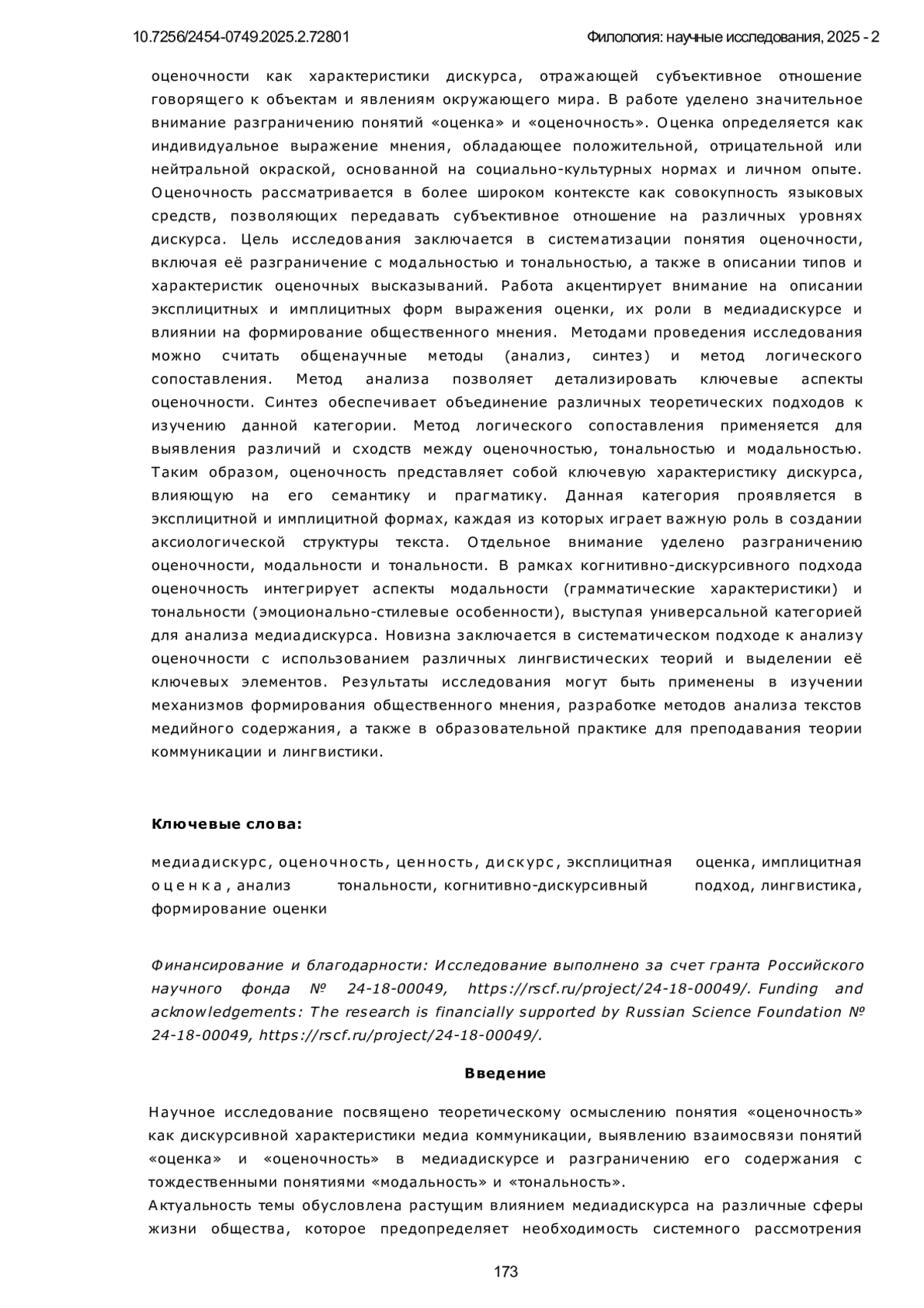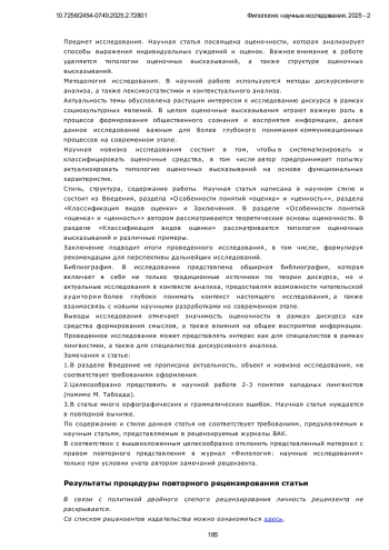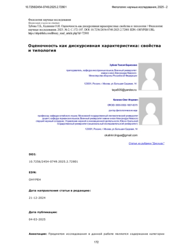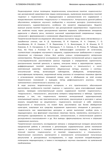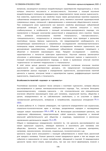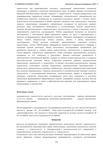 Предметом исследования в данной работе является содержание категории оценочности как характеристики дискурса, отражающей субъективное отношение говорящего к объектам и явлениям окружающего мира. В работе уделено значительное внимание разграничению понятий «оценка» и «оценочность». Оценка определяется как индивидуальное выражение мнения, обладающее положительной, отрицательной или нейтральной окраской, основанной на социально-культурных нормах и личном опыте. Оценочность рассматривается в более широком контексте как совокупность языковых средств, позволяющих передавать субъективное отношение на различных уровнях дискурса. Цель исследования заключается в систематизации понятия оценочности, включая её разграничение с модальностью и тональностью, а также в описании типов и характеристик оценочных высказываний. Работа акцентирует внимание на описании эксплицитных и имплицитных форм выражения оценки, их роли в медиадискурсе и влиянии на формирование общественного мнения. Методами проведения исследования можно считать общенаучные методы (анализ, синтез) и метод логического сопоставления. Метод анализа позволяет детализировать ключевые аспекты оценочности. Синтез обеспечивает объединение различных теоретических подходов к изучению данной категории. Метод логического сопоставления применяется для выявления различий и сходств между оценочностью, тональностью и модальностью. Таким образом, оценочность представляет собой ключевую характеристику дискурса, влияющую на его семантику и прагматику. Данная категория проявляется в эксплицитной и имплицитной формах, каждая из которых играет важную роль в создании аксиологической структуры текста. Отдельное внимание уделено разграничению оценочности, модальности и тональности. В рамках когнитивно-дискурсивного подхода оценочность интегрирует аспекты модальности (грамматические характеристики) и тональности (эмоционально-стилевые особенности), выступая универсальной категорией для анализа медиадискурса. Новизна заключается в систематическом подходе к анализу оценочности с использованием различных лингвистических теорий и выделении её ключевых элементов. Результаты исследования могут быть применены в изучении механизмов формирования общественного мнения, разработке методов анализа текстов медийного содержания, а также в образовательной практике для преподавания теории коммуникации и лингвистики.