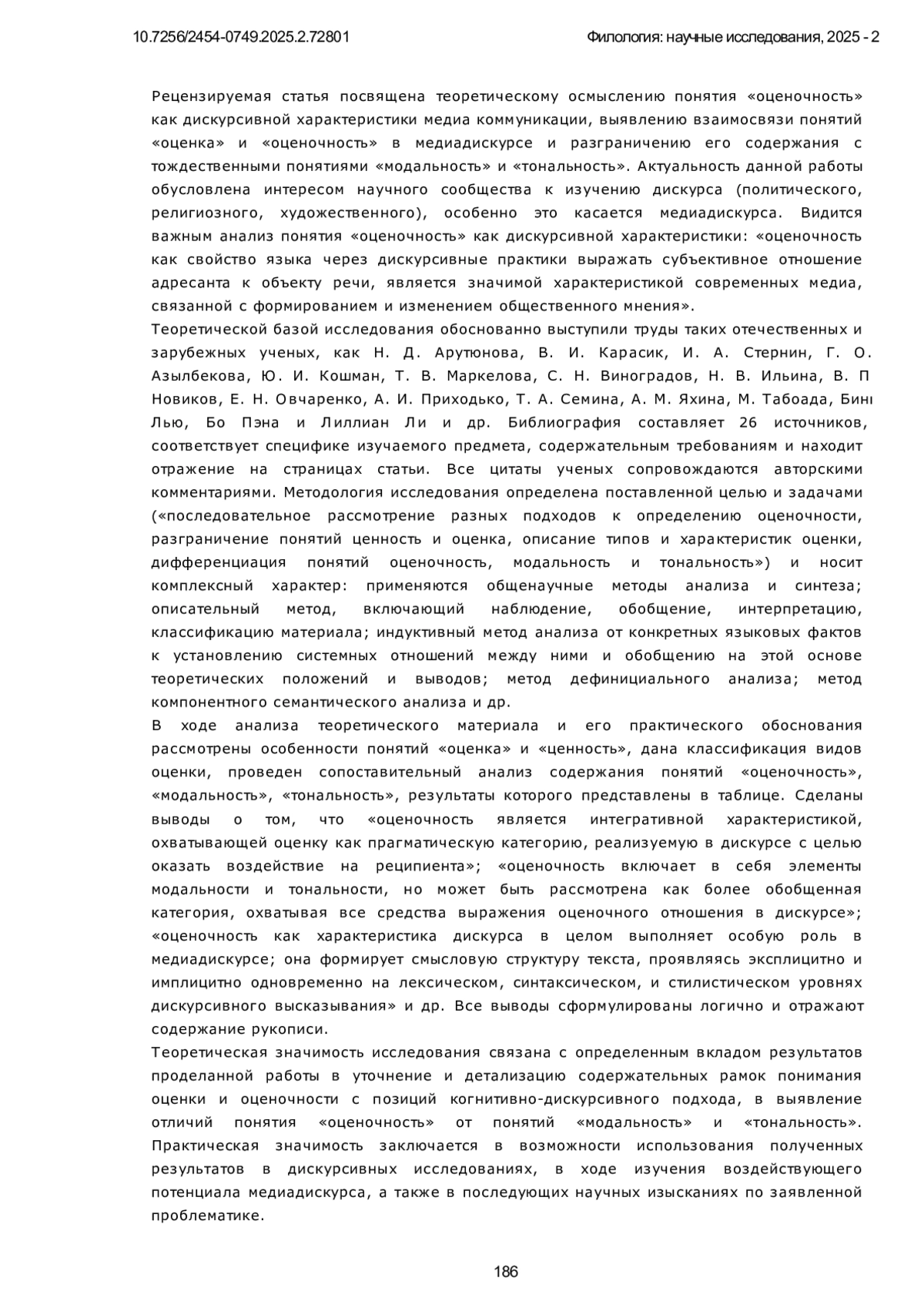 Научное исследование посвящено теоретическому осмыслению понятия «оценочность» как дискурсивной характеристики медиа коммуникации, выявлению взаимосвязи понятий «оценка» и «оценочность» в медиадискурсе и разграничению его содержания с тождественными понятиями «модальность» и «тональность».