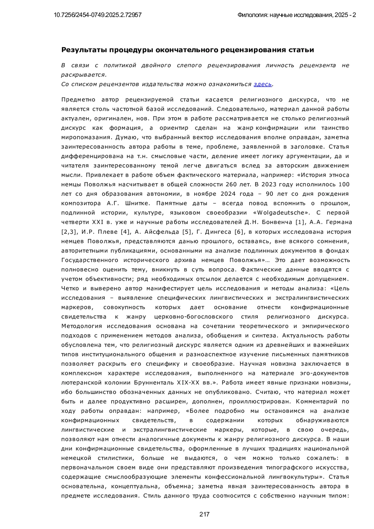 Статья посвящена рассмотрению жанрового своеобразия конфессиональных эго-документов немцев Поволжья. Предмет исследования - дискурсивные особенности, объект - лингвистические и экстралингвистические маркеры жанра религиозного дискурса на примере конфирмационных свидетельств лютеран колонии Брунненталь XIX-XX вв. Конфирмация в форме письменного свидетельства содержит цитаты из текстов Библии, фрагменты проповеди, строки гимнов и куплеты хоралов на немецком языке (лингвистические маркеры). К экстралингвистическим маркерам относятся графические изображения сюжетов библейских историй, образ Спасителя, готическая фрактура, особенности художественного оформления (флористические композиции и преобладание красного цвета), фрагменты произведений музыкальной духовной культуры. Совокупность лингвистических и экстралингвистических маркеров организует характерную четкую структуру с доминантой в виде ценностных предписаний лютеранину. Компаративистский метод позволил классифицировать образцы эго-документов. Семиотический, лингвокультурологический методы послужили выявлению маркеров жанра религиозного дискурса. Научная новизна заключается в комплексном характере исследования образцов конфессиональных эго-документов лютеран колонии Брунненталь с точки зрения их жанровой специфики. Актуальность исследования обусловлена необходимостью изучения своеобразия религиозного дискурса на основе сохранившихся подлинных письменных свидетельств. Совокупность выявленных лингвистических и экстралингвистических маркеров позволяет отнести конфирмационные свидетельства к вторичному жанру религиозного дискурса в протестантизме. Теоретическая значимость исследования заключается в том, что данная работа вносит вклад в развитие теории дискурса, характеризуя один из его типов - религиозный дискурс. Результаты исследования могут быть использованы на лекциях и практических занятиях по дисциплине «Теория языка», а также будут интересны тем, кто занимается изучением немецкой конфессиональной лингвокультуры.