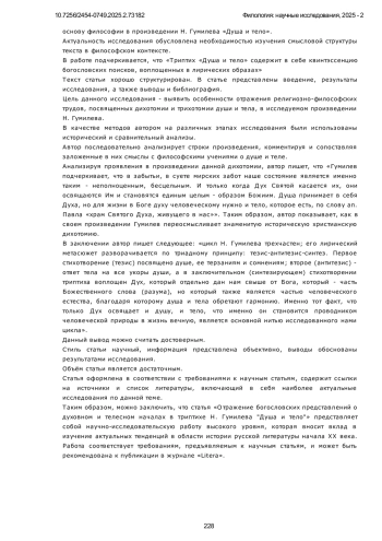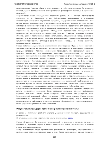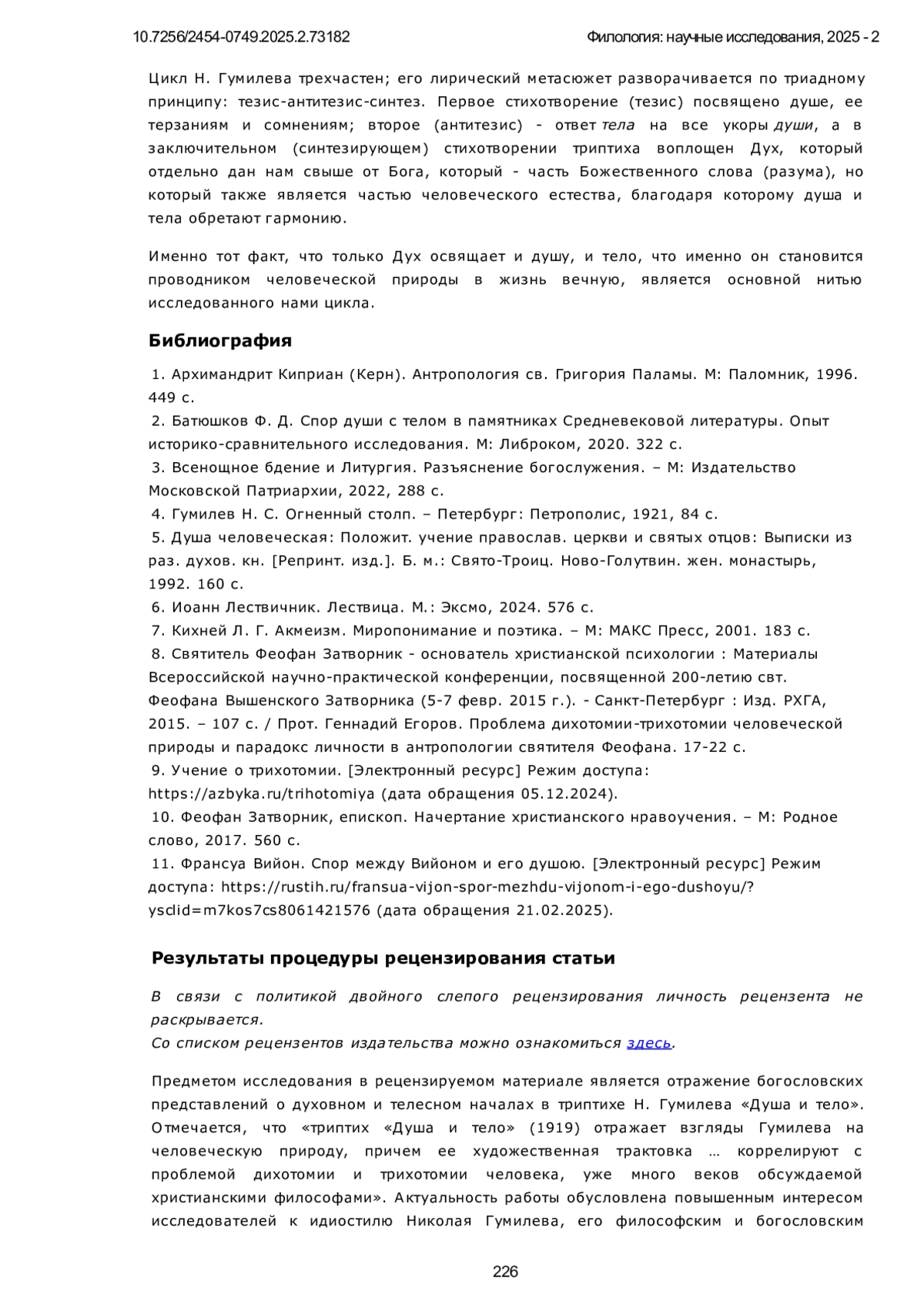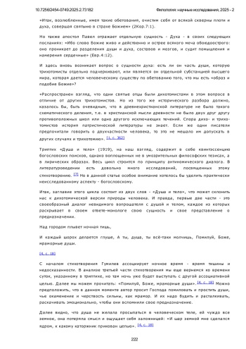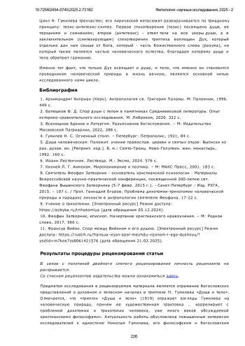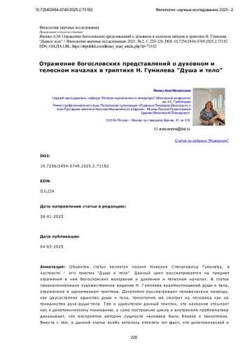 Объектом статьи является поэзия Николая Степановича Гумилева, в частности - его триптих “Душа и тело”. Данный цикл рассматривается на предмет отражения в нем богословских воззрений о духовном и телесном началах. В статье проанализировано художественное видение Н. Гумилева взаимоотношений души и тела, отраженное в одноименном триптихе. Дихотомия рассматривает человеческую природу, как двусоставное единство души и тела, трихотомия же смотрит на человека как на триединство духа-души-тела. Тем и удивителен данный триптих, что название отсылает нас к дихотомическому пониманию, а само построение цикла и внутренняя проблематика доказывает, что восприятие автором сущности человека было близко к трихотомии. Вместе с тем, в данной статье особо хотелось отметить тот факт, что дихотомический и трихотомический взгляды на природу человека не противоречат друг другу. В работе были использованы следующие методы: сравнительно - исторический, системно - типологический и культурно - исторический. Произведены контекстный и интертекстуальный анализы триптиха, а также мифопоэтический и структурно-семантический анализ. Научная новизна статьи весьма высока, так как анализ произведений авторов Серебряного века на стыке филологической науки и богословия проводится довольно редко. В данной работе было важно отобразить тот факт, что Николай Степанович Гумилев был христианином по сути, его мировосприятие никак не противоречило учению Православной Церкви. Также известно, что поэты Серебряного века во многих своих работах опирались на средневековые произведения, а в период Средневековья диалог души и тела был особенно распространен. Произведен подробный анализ триптиха “Душа и тело”, рассмотрены авторские воззрения на проблемы соотношения материального и духовного начал. Доказано, что поэт трактовал природу человеческой сущности сообразно с трихотомической концепцией отцов православной Церкви.