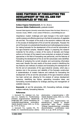 Предмет: современные вызовы и стремительные изменения в мире требуют тщательного анализа и эффективного планирования в сфере производства растительных масел и жиров. Предметом исследования выступают экономические отношения, возникающие в процессе развития масложирового подкомплекса. Цель: целью исследования выступают обоснование теоретико-методологических положений по составлению прогнозов развития масложирового подкомплекса АПК. Дизайн исследования: при подготовке материалов исследования статьи был проведен обзор актуальных работ как отечественных, так и зарубежных авторов по теме исследования, выполнен анализ современных подходов в сфере прогнозирования, а так же выявлены особенности прогнозирования развития масложирового подкомплекса. Использовались методы анализа текущей ситуации и обобщения информации. Результаты: основные результаты исследования заключаются в выявлении ключевых особенностей и методов анализа и прогнозирования развития масложирового подкомплекса АПК, играющих определяющую роль в точности и достоверности построенных прогнозов. Произведена систематизация современных особенностей и методов прогнозирования развития масложирового подкомплекса АПК, позволяющих проводить анализ различных сценариев развития, выявлять ключевые факторы, генерировать инновационные идеи, формулировать рекомендации для стратегического планирования и управления имеющимися ресурсами.