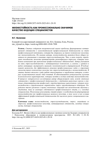 Статья содержит теоретический анализ проблемы формирования мотивационной готовности к самостоятельной профессиональной деятельности на этапе профессиональной подготовки, которая бы опиралась на такое комплексное качество, как жизнестойкость. По мнению автора, жизнестойкость является более общим понятием по отношению к понятию стрессоустойчивости. Что, в свою очередь, определяет способность личности противостоять разнообразным стрессам, которые неизбежно возникают при выполнении профессиональных обязанностей. Автор указывает на связь стрессоустойчивости с мотивационным комплексом, а, именно, с уровнем и видом мотивации: внутренней и внешней, положительной и отрицательной. И подчеркивает важность для эффективного решения профессиональных задач в структуре личности таких комплексных качеств, как стрессоустойчивость и жизнестойкость. В статье дается отсылка к ряду работ отечественных и зарубежных авторов, в которых осуществляется анализ этих понятий. И обосновывается актуальность изучения психологических характеристик, которые входят в состав свойства жизнестойкости. В процессе эмпирического исследования автор обнаруживает связь между степенью готовности к профессиональной деятельности у студентов выпускных курсов и степенью удовлетворенности профессией у трудоустроенных выпускников с уровнем жизнестойкости и определенными стратегиями стресс преодолевающего поведения. Определено также различие в оценке жизненных ситуаций как возможности обучения у студентов, пока не имеющих собственного профессионального опыта, и у молодых специалистов. Полученные результаты ставят вопрос о необходимости формирования жизнестойкости как профессионально важного качества, в том числе и как условия эффективной профессиональной деятельности без высокого риска эмоционального выгорания.