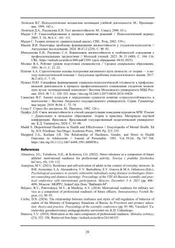 21. Церфус Д.Н. Связь жизнестойкости и стилей саморегуляции поведения курсантов МЧС России // Дошкольное и начальное образование: теория и практика. Материалы научной конференции. Ярославль: Ярославский государственный педагогический университет им. К.Д. Ушинского, 2024. С. 93-98.