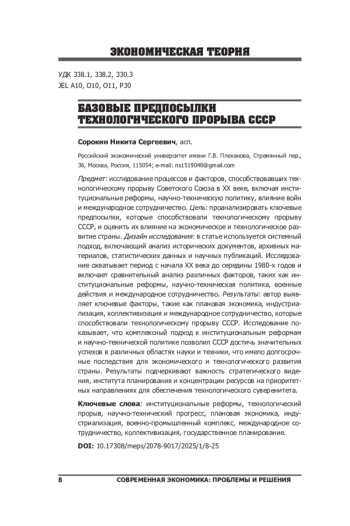 Предмет, исследование процессов и факторов, способствовавших технологическому прорыву Советского Союза в XX веке, включая институциональные реформы, научно-техническую политику, влияние войн и международное сотрудничество. Цель: проанализировать ключевые предпосылки, которые способствовали технологическому прорыву СССР, и оценить их влияние на экономическое и технологическое развитие страны. Дизайн исследования: в статье используется системный подход, включающий анализ исторических документов, архивных материалов, статистических данных и научных публикаций. Исследование охватывает период с начала XX века до середины 1980-х годов и включает сравнительный анализ различных факторов, таких как институциональные реформы, научно-техническая политика, военные действия и международное сотрудничество. Результаты: автор выявляет ключевые факторы, такие как плановая экономика, индустриализация, коллективизация и международное сотрудничество, которые способствовали технологическому прорыву СССР. Исследование показывает, что комплексный подход к институциональным реформам и научно-технической политике позволил СССР достичь значительных успехов в различных областях науки и техники, что имело долгосрочные последствия для экономического и технологического развития страны. Результаты подчеркивают важность стратегического видения, института планирования и концентрации ресурсов на приоритетных направлениях для обеспечения технологического суверенитета.
