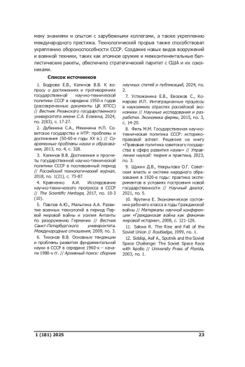 3. Калинов В.В. Достижения и просчеты государственной научно-технической политики СССР в послевоенный период // Российский технологический журнал, 2018, no. 1(21), c. 73-87. EDN: YPKQEG