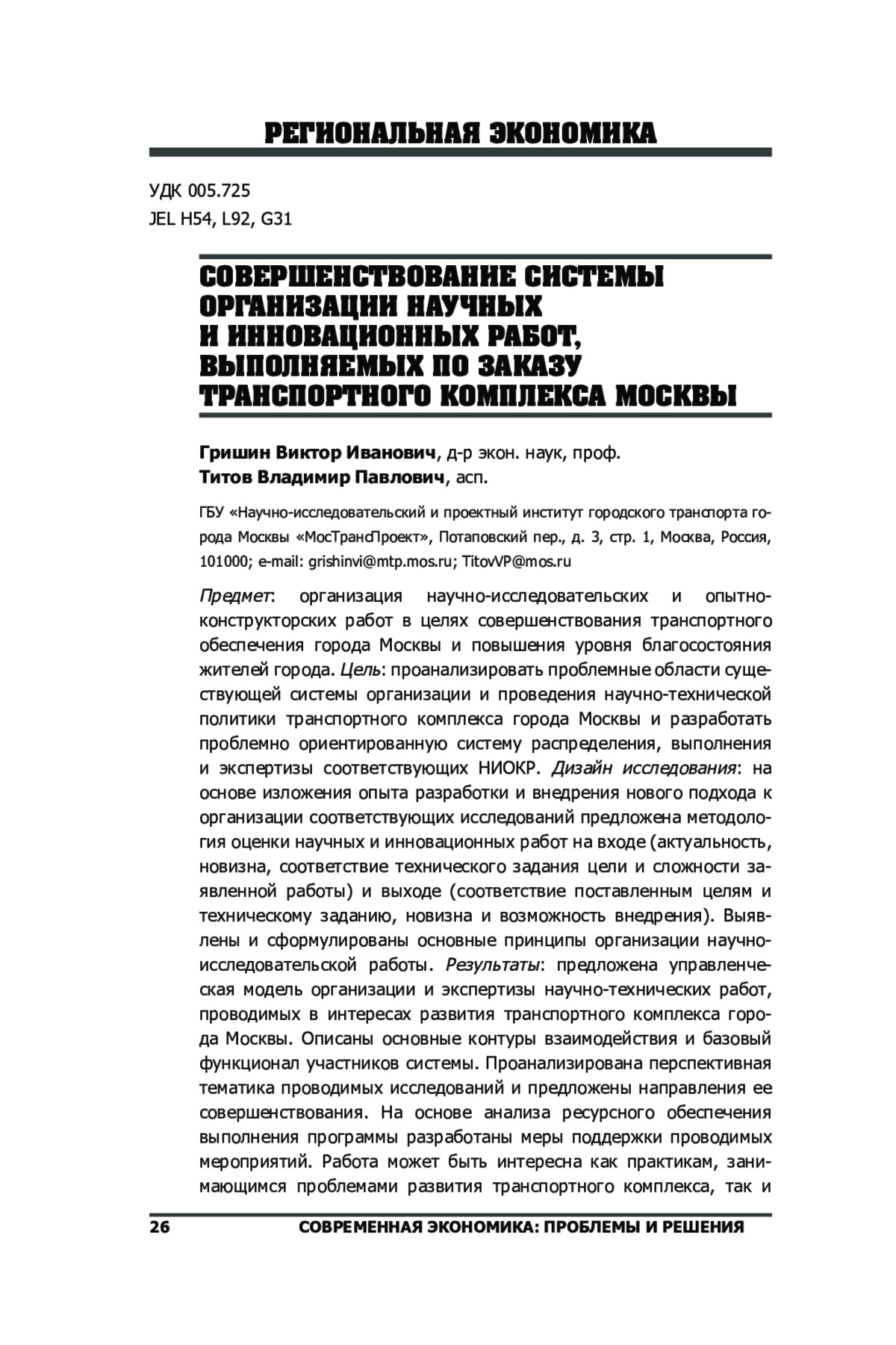 Предмет, организация научно-исследовательских и опытноконструкторских работ в целях совершенствования транспортного обеспечения города Москвы и повышения уровня благосостояния жителей города. Цель: проанализировать проблемные области существующей системы организации и проведения научно-технической политики транспортного комплекса города Москвы и разработать проблемно ориентированную систему распределения, выполнения и экспертизы соответствующих НИОКР. Дизайн исследования: на основе изложения опыта разработки и внедрения нового подхода к организации соответствующих исследований предложена методология оценки научных и инновационных работ на входе (актуальность, новизна, соответствие технического задания цели и сложности заявленной работы) и выходе (соответствие поставленным целям и техническому заданию, новизна и возможность внедрения). Выявлены и сформулированы основные принципы организации научноисследовательской работы. Результаты: предложена управленческая модель организации и экспертизы научно-технических работ, проводимых в интересах развития транспортного комплекса города Москвы. Описаны основные контуры взаимодействия и базовый функционал участников системы. Проанализирована перспективная тематика проводимых исследований и предложены направления ее совершенствования. На основе анализа ресурсного обеспечения выполнения программы разработаны меры поддержки проводимых мероприятий. Работа может быть интересна как практикам, занимающимся проблемами развития транспортного комплекса, так и ученым, изучающим вопросы организации научных исследований.