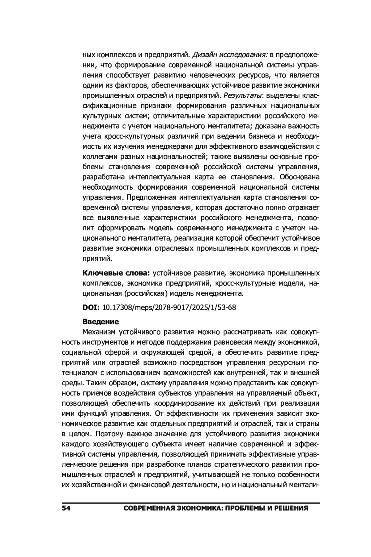 Предмет: последние десятилетия характеризуются возрастанием роли управленческой деятельности в функционировании промышленных отраслей и предприятий, а также устойчивом развитии экономики в целом. В связи с этим формирование современной системы управления с учетом национальных особенностей, соответствующей мировым стандартам и учитывающей зарубежный опыт, является весьма актуальным вопросом. Предметом исследования являются процессы управления, обеспечивающие устойчивое функционирование и развитие отраслевого промышленного комплекса. Объектом исследования являются современные модели принятия управленческих решений. Цель: исследование понятия, важнейших компонентов и принципов формирования различных национальных культурных систем, а также исследование роли формирования современной национальной системы управления в обеспечении устойчивого развития экономики отраслевых промышленных комплексов и предприятий. Основным методом исследования является систематизация и сравнительный анализ специальной экономической литературы, а также научных трудов, статей зарубежных и отечественных ученых-экономистов по проблемам и тенденциям развития современных моделей управления в России как элемента устойчивого развития экономики отраслевых промышленных комплексов и предприятий. Дизайн исследования: в предположении, что формирование современной национальной системы управления способствует развитию человеческих ресурсов, что является одним из факторов, обеспечивающих устойчивое развитие экономики промышленных отраслей и предприятий. Результаты: выделены классификационные признаки формирования различных национальных культурных систем; отличительные характеристики российского менеджмента с учетом национального менталитета; доказана важность учета кросс-культурных различий при ведении бизнеса и необходимость их изучения менеджерами для эффективного взаимодействия с коллегами разных национальностей; также выявлены основные проблемы становления современной российской системы управления, разработана интеллектуальная карта ее становления. Обоснована необходимость формирования современной национальной системы управления. Предложенная интеллектуальная карта становления современной системы управления, которая достаточно полно отражает все выявленные характеристики российского менеджмента, позволит сформировать модель современного менеджмента с учетом национального менталитета, реализация которой обеспечит устойчивое развитие экономики отраслевых промышленных комплексов и предприятий.