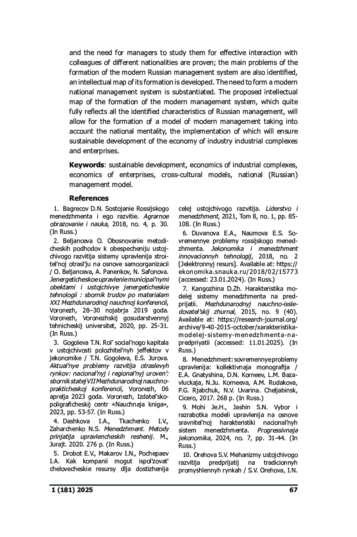 1. Багрецов Д.Н. Состояние российского менеджмента и его развитие // Аграрное образование и наука, 2018, no. 4, с. 30. EDN: YMHREL