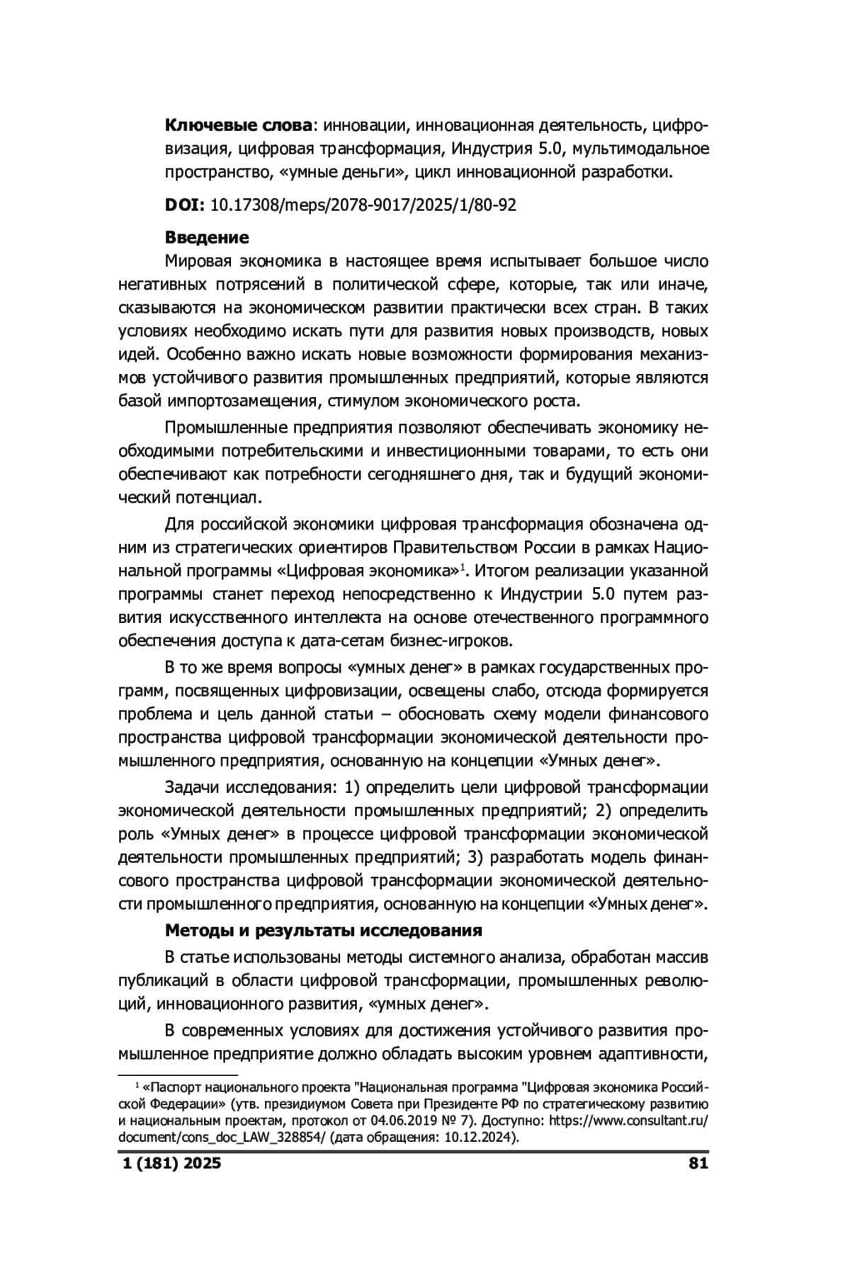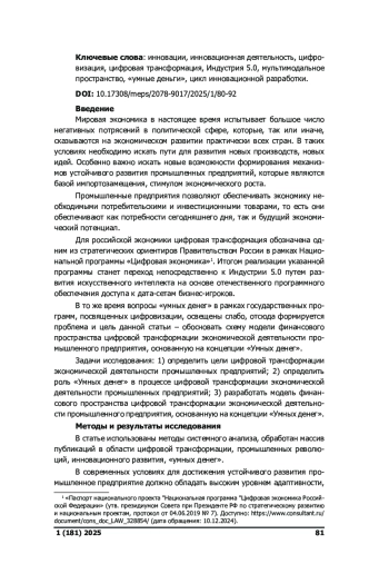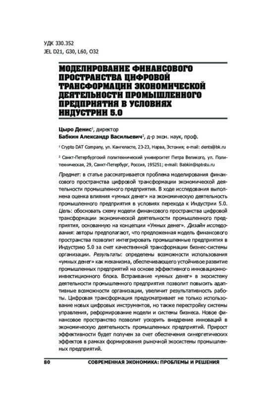 Предмет: в статье рассматривается проблема моделирования финансового пространства цифровой трансформации экономической деятельности промышленного предприятия. В ходе исследования выполнена оценка влияния «умных денег» на экономическую деятельность промышленного предприятия в условиях перехода к Индустрии 5.0. Цель: обосновать схему модели финансового пространства цифровой трансформации экономической деятельности промышленного предприятия, основанную на концепции «Умных денег». Дизайн исследования: авторы предполагают, что предложенная модель финансового пространства позволит интегрировать промышленные предприятия в Индустрию 5.0 за счет качественной трансформации бизнес-системы организации. Результаты: определены возможности использования «умных денег» как механизма, обеспечивающего устойчивое развитие промышленных предприятий на основе эффективного инновационноинвестиционного блока. Встраивание «умных денег» в экосистему деятельности промышленного предприятия позволит повысить адаптивные возможности организации, увеличит результативность работы. Цифровая трансформация предусматривает не только использование новых цифровых инструментов, но также перестройку системы управления, реформирование модели и системы бизнеса. Новое финансовое пространство позволит ускорить внедрение инноваций в экономическую деятельность промышленных предприятий. Прирост эффективности будет получен за счет обеспечения синергетических эффектов в рамках формирования рыночной экосистемы промышленных предприятий.
