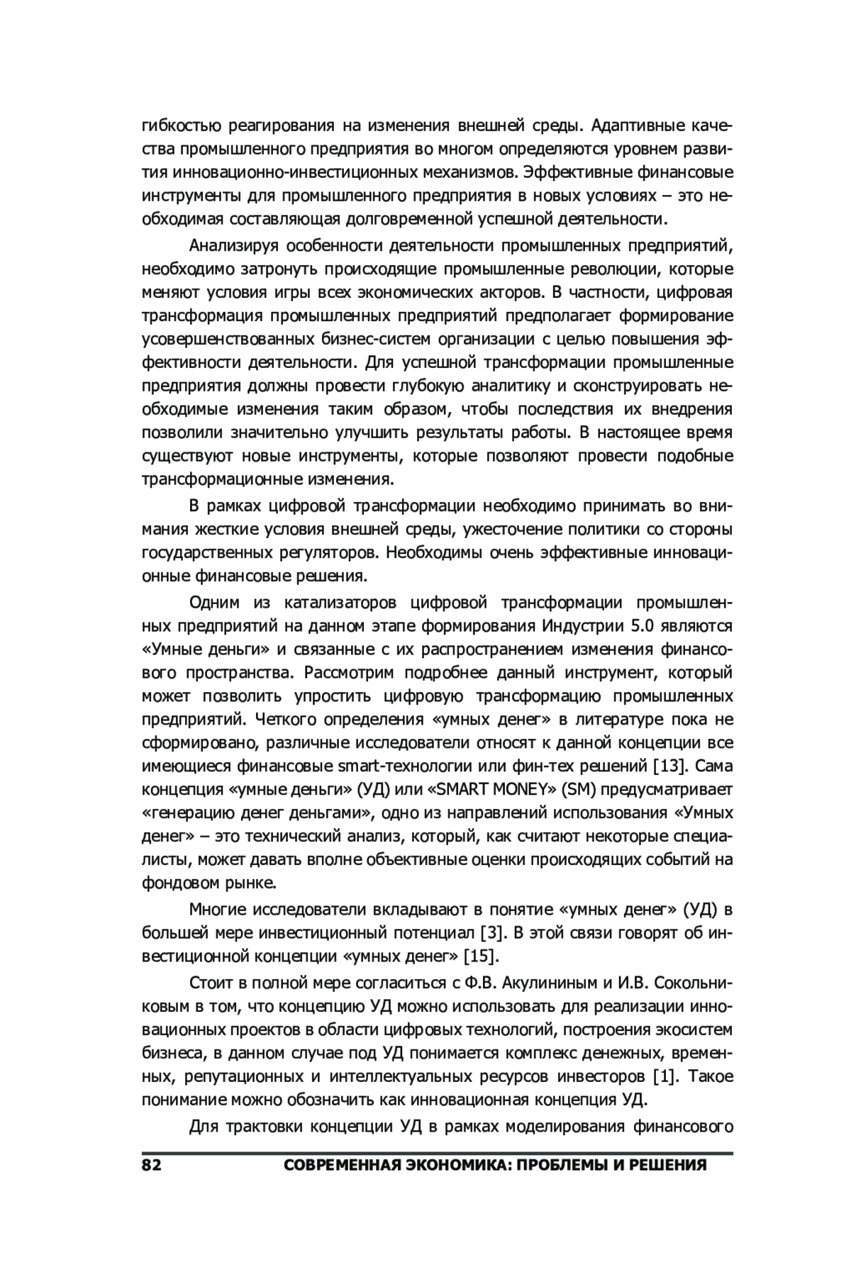 1. Акулинин Ф.В., Сокольникова И.В. Концепция “умные деньги” и инвестирование в инновационные проекты в области цифровых технологий // Транспортное дело России, 2020, no. 6, с. 55-59. EDN: VPFTSK