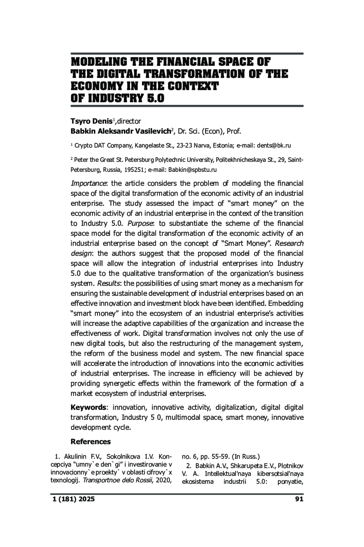 3. Бабкин А.В., Шкарупета Е.В., Плотников В.А. Интеллектуальная киберсоциальная экосистема индустрии 5.0: понятие, сущность, модель // Экономическое возрождение России, 2021, no. 4 (70), с. 39-62. EDN: TCYAIR