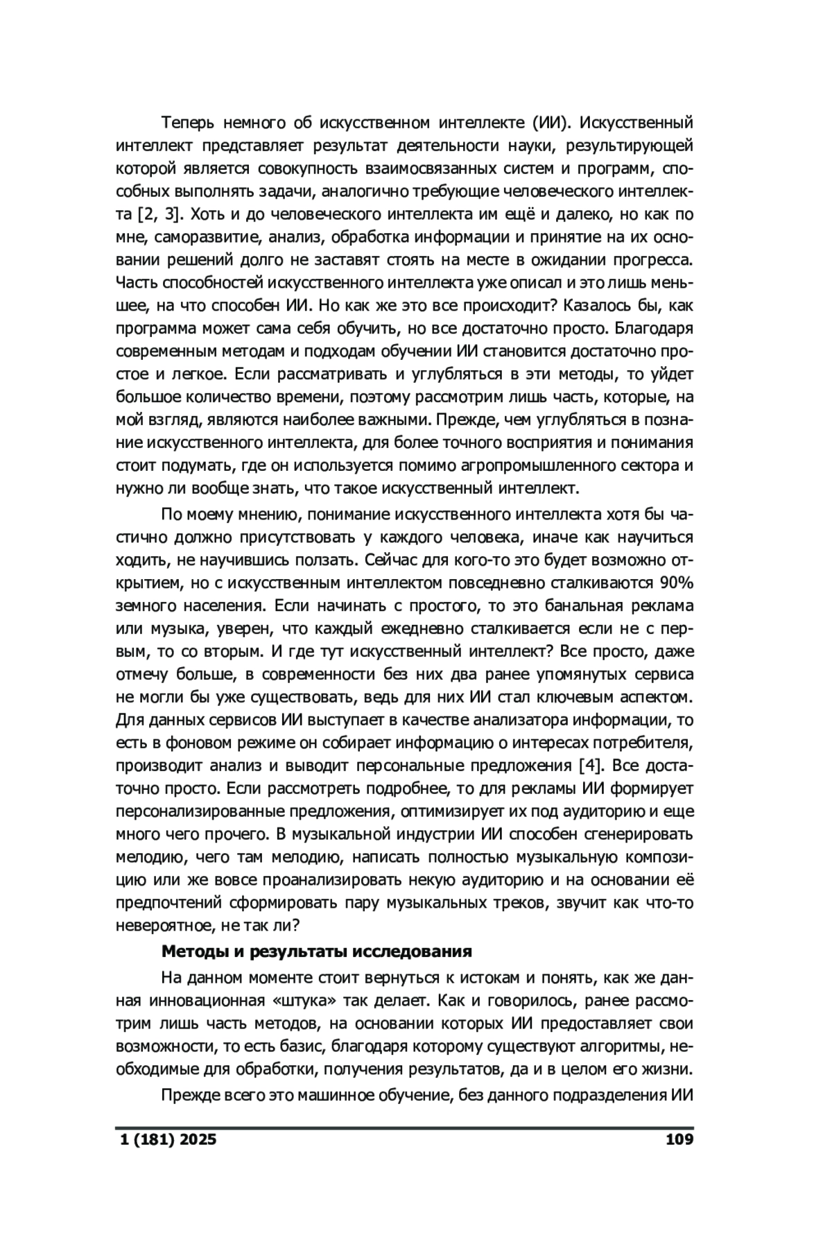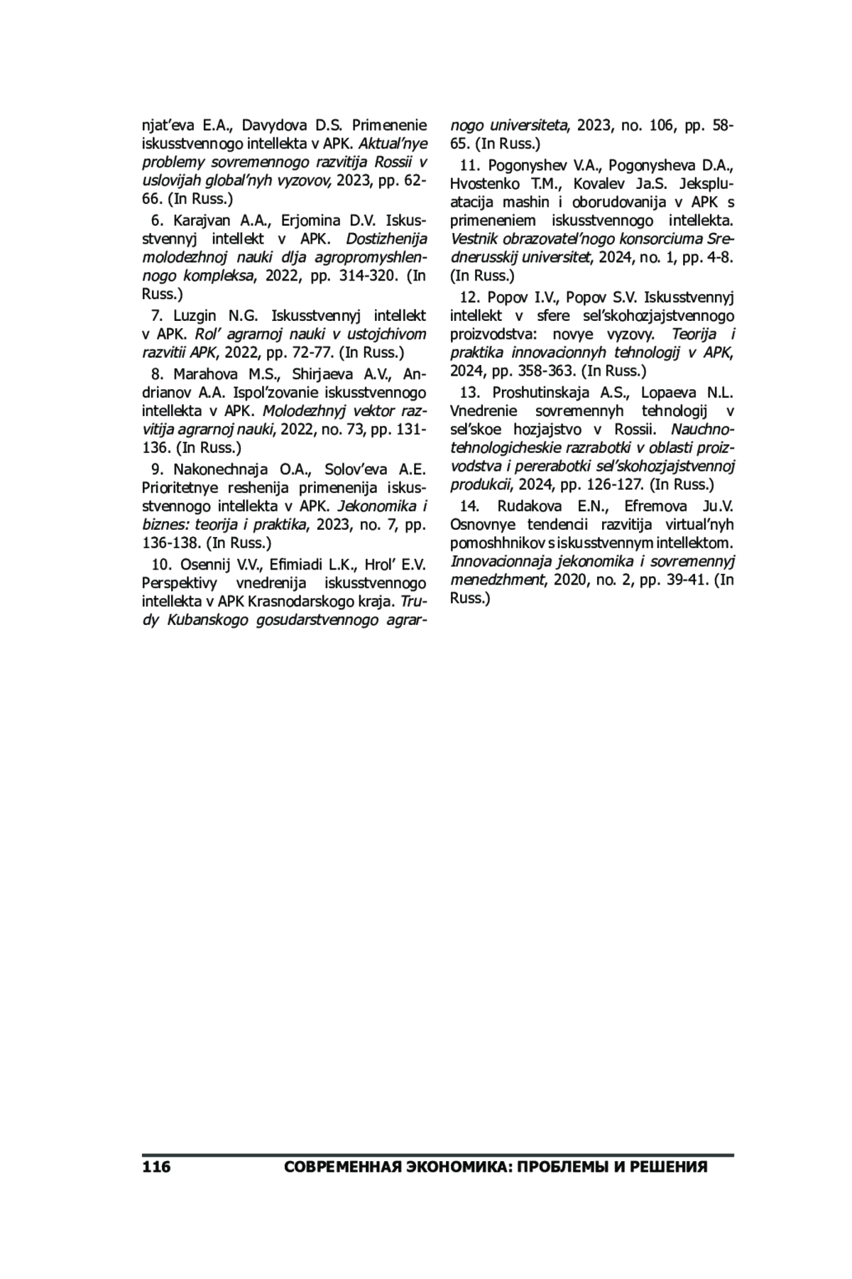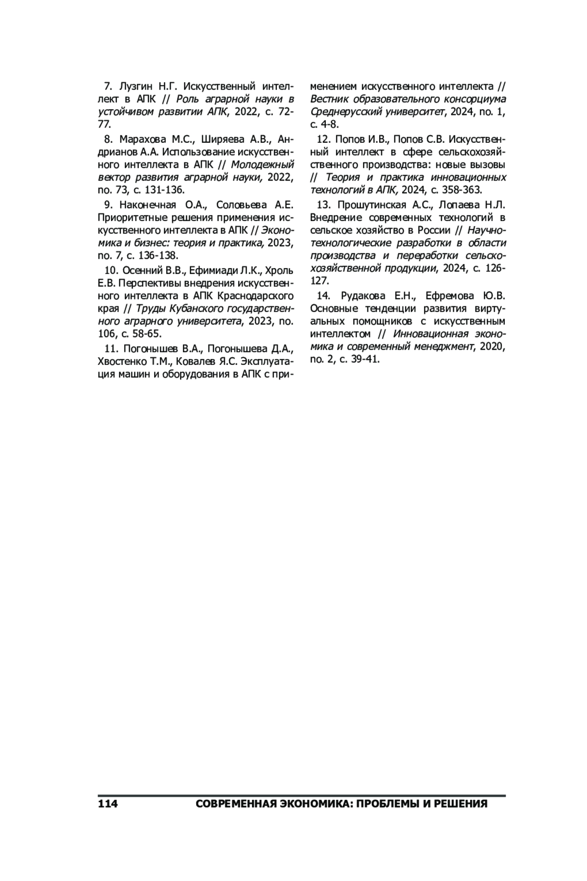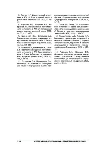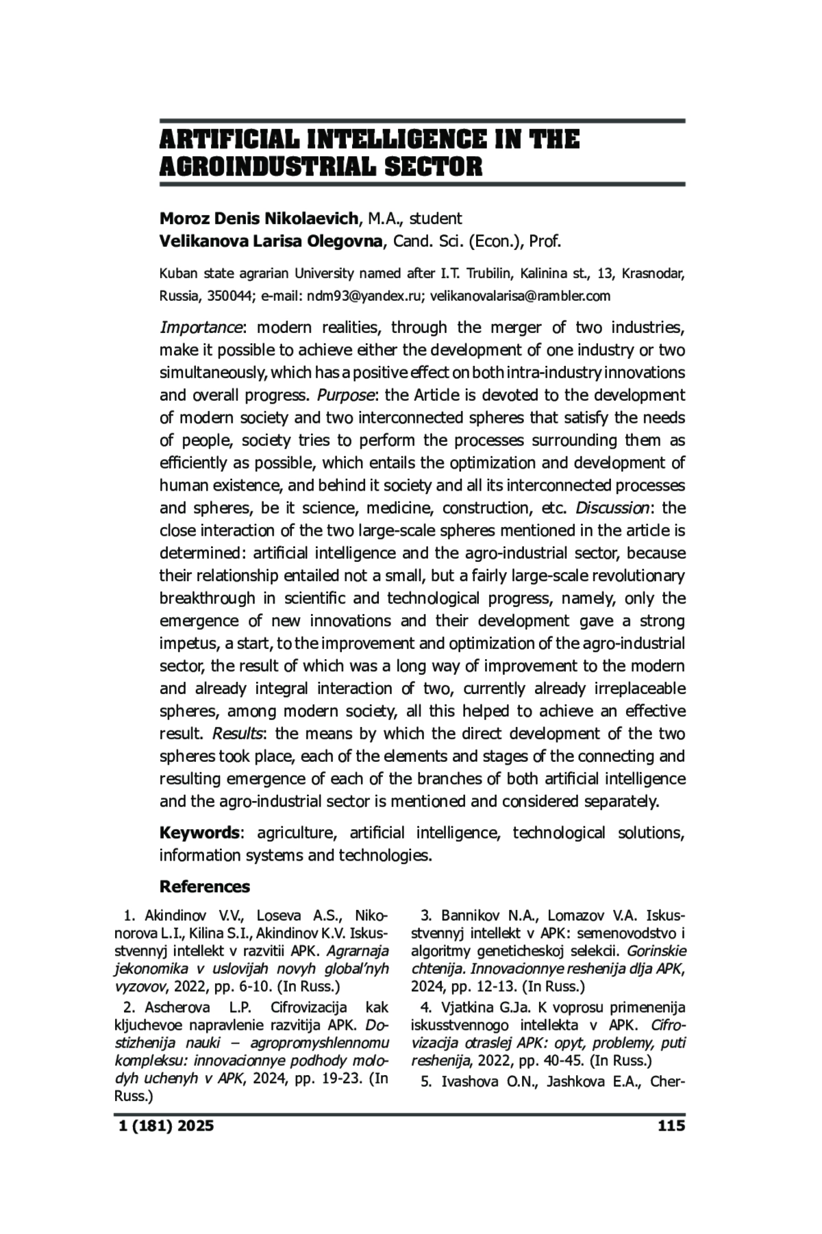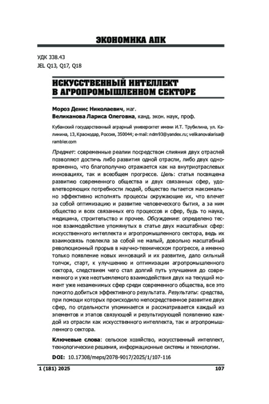 МОРОЗ Д. Н., ВЕЛИКАНОВА Л. О. ИСКУССТВЕННЫЙ ИНТЕЛЛЕКТ В АГРОПРОМЫШЛЕННОМ СЕКТОРЕ // СОВРЕМЕННАЯ ЭКОНОМИКА: ПРОБЛЕМЫ И РЕШЕНИЯ. 2025. № 1 (181)