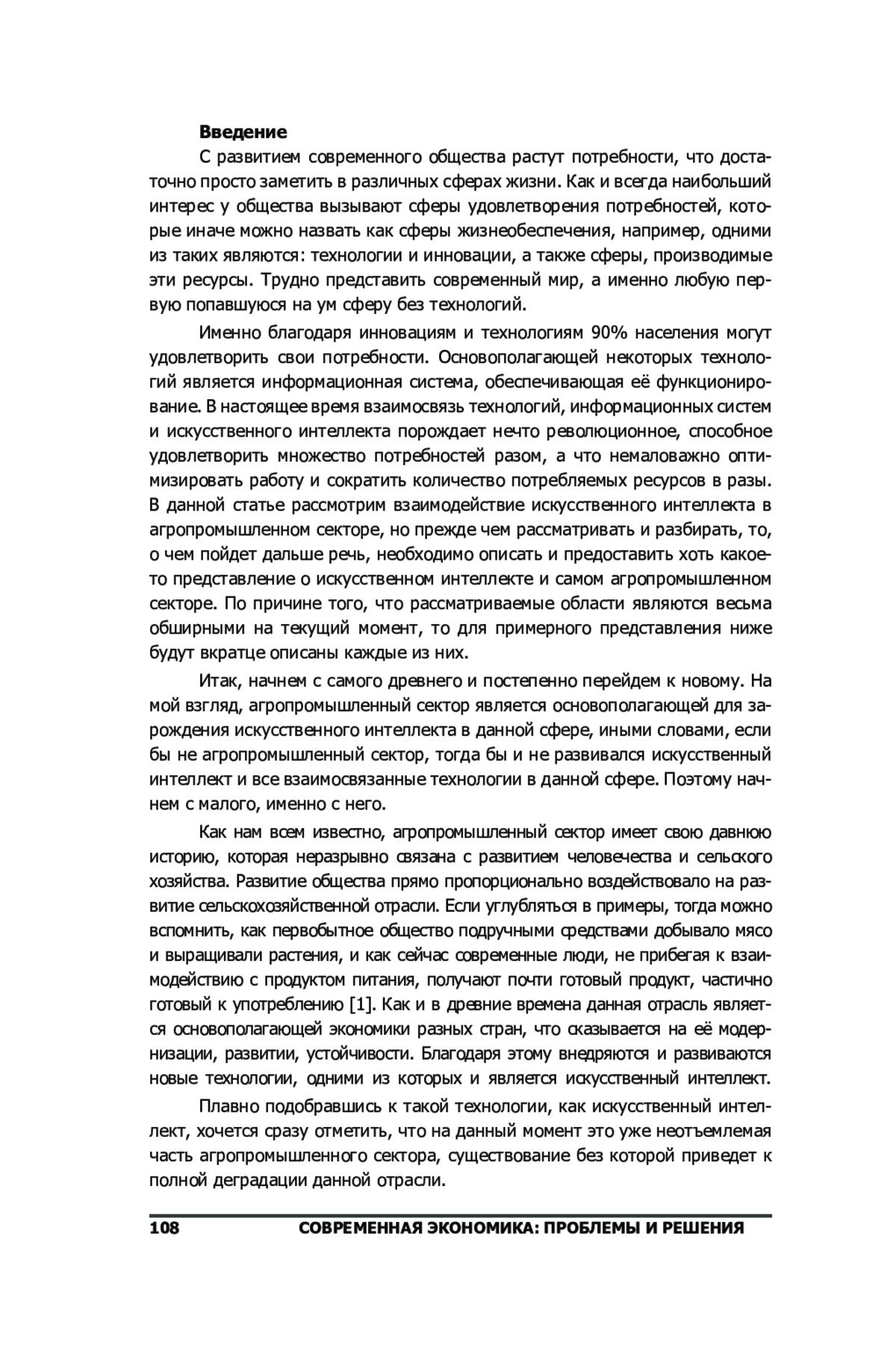 Предмет: современные реалии посредством слияния двух отраслей позволяют достичь либо развития одной отрасли, либо двух одновременно, что благополучно отражается как на внутриотраслевых инновациях, так и всеобщем прогрессе. Цель: статья посвящена развитию современного общества и двух связанных сфер, удовлетворяющих потребности людей, общество пытается максимально эффективно исполнять процессы окружающие их, что влечет за собой оптимизацию и развитие человеческого бытия, а за ним общество и всех связанных его процессов и сфер, будь то наука, медицина, строительство и прочее. Обсуждение: определено тесное взаимодействие упомянутых в статье двух масштабных сфер: искусственного интеллекта и агропромышленного сектора, ведь их взаимосвязь повлекла за собой не малый, довольно масштабный революционный прорыв в научно-техническом прогрессе, а именно только появление новых инноваций и их развитие, дало сильный толчок, старт, к улучшению и оптимизации агропромышленного сектора, следствием чего стал долгий путь улучшения до современного и уже неотъемлемого взаимодействия двух на текущий момент уже незаменимых сфер среди современного общества, все это помогло добиться эффективного результата. Результаты: средства, при помощи которых происходило непосредственное развитие двух сфер, по отдельности упоминается и рассматривается каждый из элементов и этапов связующей и результирующей появлению каждой из отрасли как искусственного интеллекта, так и агропромышленного сектора.
