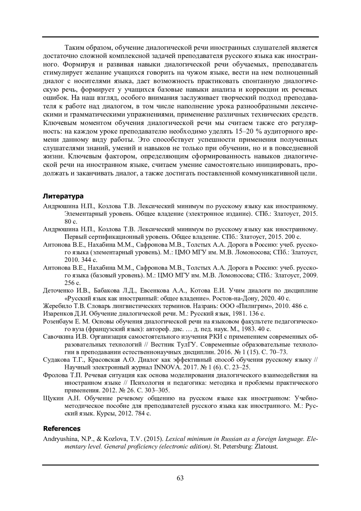 5. Деточенко И.В., Бабакова Л.Д., Евсенкова А.А., Котова Е.И. Учим диалоги по дисциплине “Русский язык как иностранный: общее владение”. Ростов-на-Дону, 2020. 40 с.