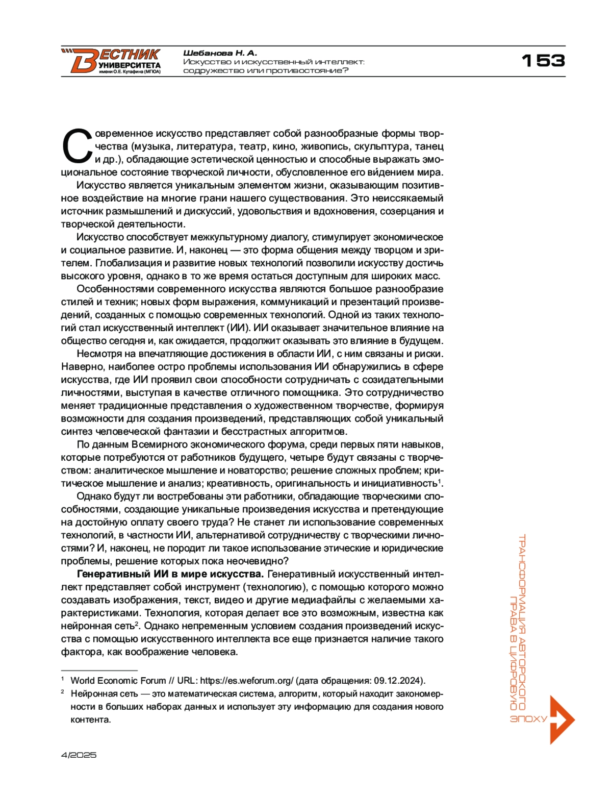 Трудно переоценить значение искусства в жизни человека. Это уникальная сфера жизнедеятельности, где в создаваемых произведениях автор отражает свое эмоциональное восприятие мира. Развитие компьютерных технологий преобразило сферу искусства, наделив творческих личностей необыкновенными возможностями. Создание генеративного искусственного интеллекта ознаменовало начало сотрудничества человека и нейронной сети. Однако так ли безоблачно будущее искусства, которое создают теперь не только творческие личности, но и машины? Как следует определять результат такого сотрудничества, кто является обладателем и каких именно прав на него? Можно ли относить этот результат к произведению искусства? В статье рассмотрены юридические проблемы, возникшие вследствие применения генеративного ИИ, а также этические проблемы, от решения которых зависит будущее людей творческого труда.
