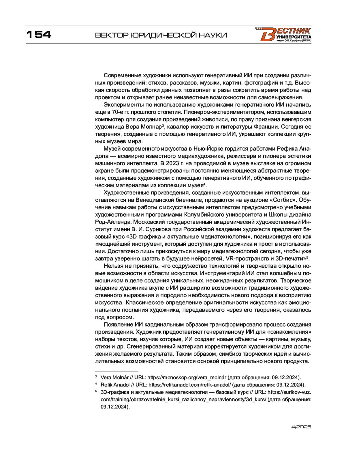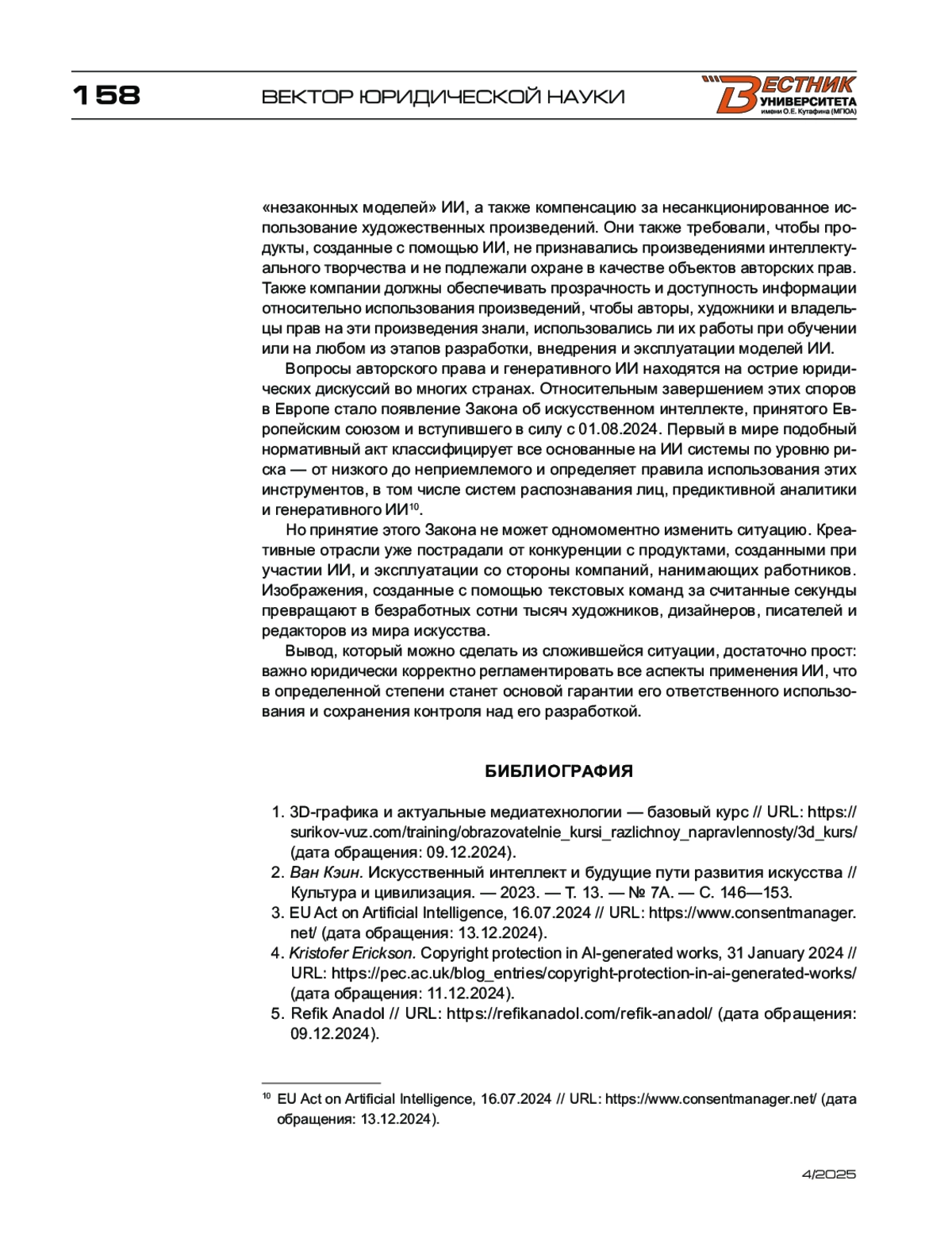 4. Kristofer Erickson. Copyright protection in AI-generated works, 31 January 2024 // URL: https://pec.ac.uk/blog_entries/copyright-protection-in-ai-generated-works (дата обращения: 11.12.2024).