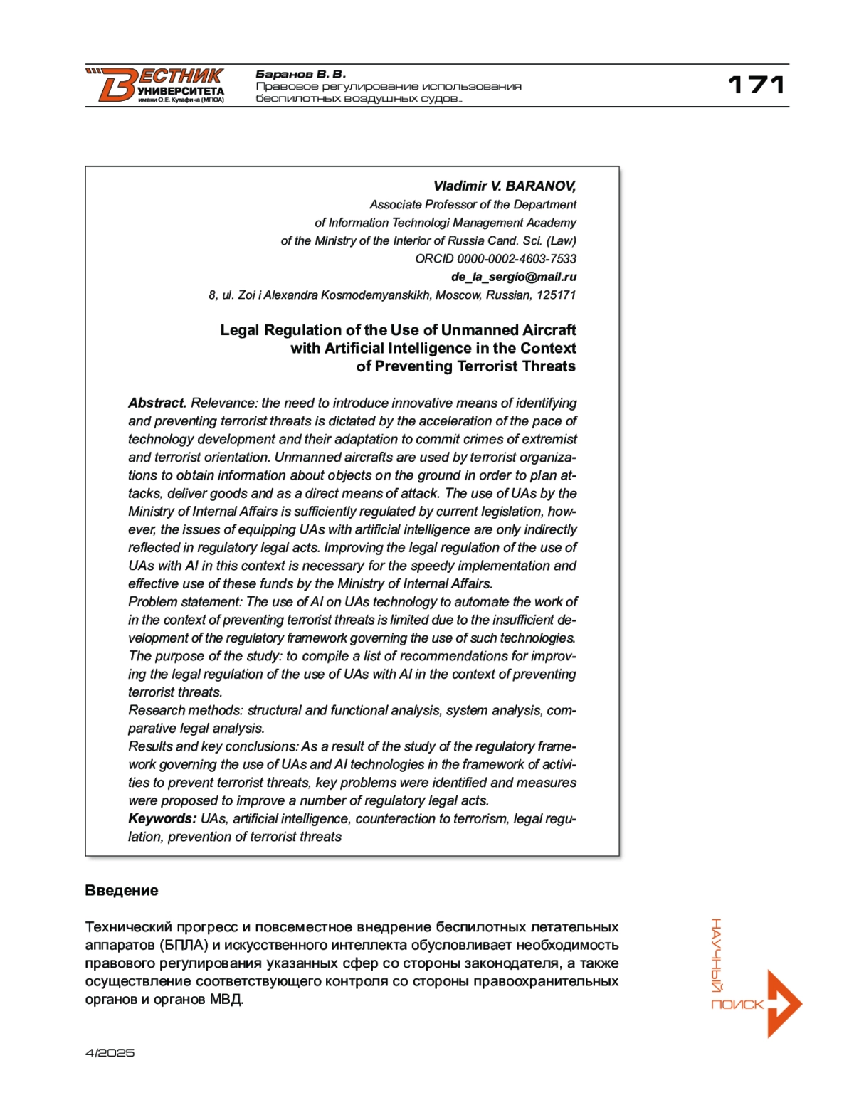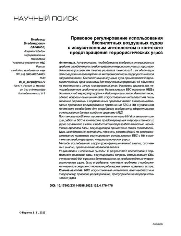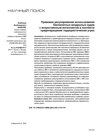 Актуальность: необходимость внедрения инновационных средств определения и предотвращения террористических угроз продиктована ускорением темпов развития технологий и их адаптации для совершения преступлений экстремистской и террористической направленности. Беспилотные воздушные суда применяются террористическими организациями для получения информации об объектах на местности с целью планирования атак, доставки грузов и как непосредственное средство атаки. Использование БВС органами МВД в достаточной мере регулируется действующим законодательством, однако вопросы оснащения БВС искусственным интеллектом лишь косвенно отражены в нормативных правовых актах. Совершенствование правового регулирования применения БВС с ИИ в указанном контексте необходимо для скорейшего внедрения и эффективного использования данных средств органами МВД.