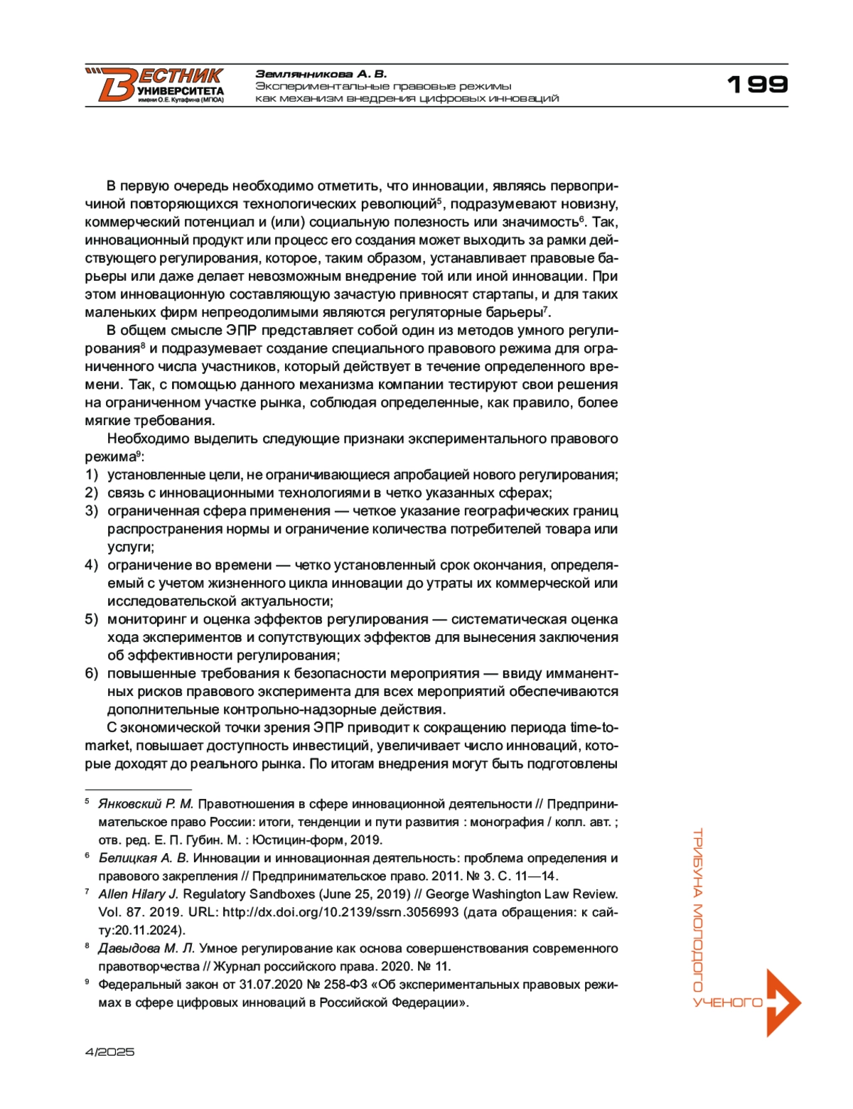 1. Громова Е. А. К вопросу об экспериментальных правовых режимах создания цифровых инноваций (регуляторных песочницах) // Вестник ЮУрГУ. - Серия: Право. - 2019. - № 3. - С. 36-40.