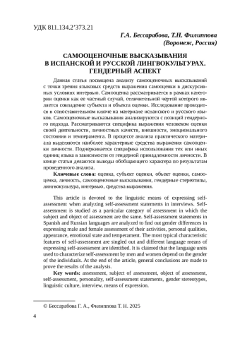 Данная статья посвящена анализу самооценочных высказываний с точки зрения языковых средств выражения самооценки в дискурсивных условиях интервью. Самооценка рассматривается в рамках категории оценки как ее частный случай, отличительной чертой которого является совпадение субъекта и объекта оценки. Исследование проводится в сопоставительном ключе на материале испанского и русского языков. Самооценочные высказывания анализируются с позиций гендерного подхода. Рассматриваются специфика выражения человеком оценки своей деятельности, личностных качеств, внешности, эмоционального состояния и темперамента. В процессе анализа практического материала выделяются наиболее характерные средства выражения самооценки личности. Подчеркивается специфика использования тех или иных единиц языка в зависимости от гендерной принадлежности личности. В конце статьи делаются выводы обобщающего характера по результатам проведенного анализа. This article is devoted to the linguistic means of expressing selfassessment when analyzing self-assessment statements in interviews. Selfassessment is studied as a particular category of assessment in which the subject and object of assessment are the same. Self-assessment statements in Spanish and Russian languages are analyzed to find out gender differences in expressing male and female assessment of their activities, personal qualities, appearance, emotional state and temperament. The most typical characteristic features of self-assessment are singled out and different language means of expressing self-assessment are identified. It is claimed that the language units used to characterize self-assessment by men and women depend on the gender of the individuals. At the end of the article, general conclusions are made to prove the results of the analysis.