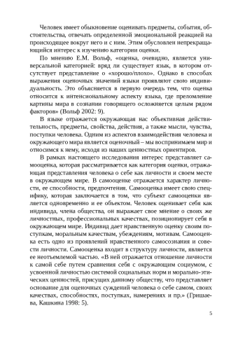 1. Вольф Е.М. Функциональная семантика оценки. - М.: Наука, 2002. - 260 с. Гришаева Л.И., Кашкина О.В. Кросскулътурное прагмалингвистическое исследование русских и немецких языковых средств выражения самооценки личности // Социокультурные проблемы перевода. - Воронеж, 1998. - С. 47-58.