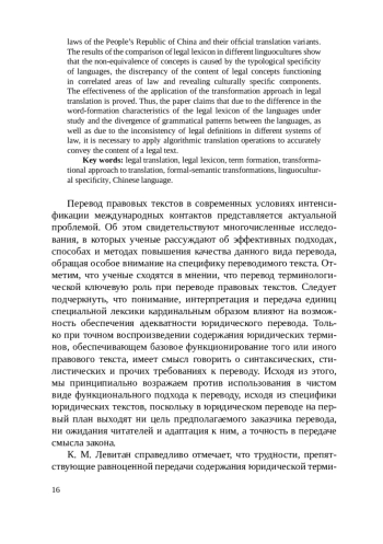 Ключевые фразы: юридический перевод, правовая лексика, терминообразование, трансформационный подход к переводу, формально-семантические преобразования, лингвокультурологическая специфика, китайский язык