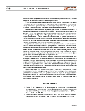 1. Бойко О. А., Унукович А. С. Детерминанты латентных преступлений, совершаемых с использованием информационно-коммуникационных технологий // Юридический вестник Самарского университета. - 2020. - Т. 6. - № 3. - С. 53-59.
