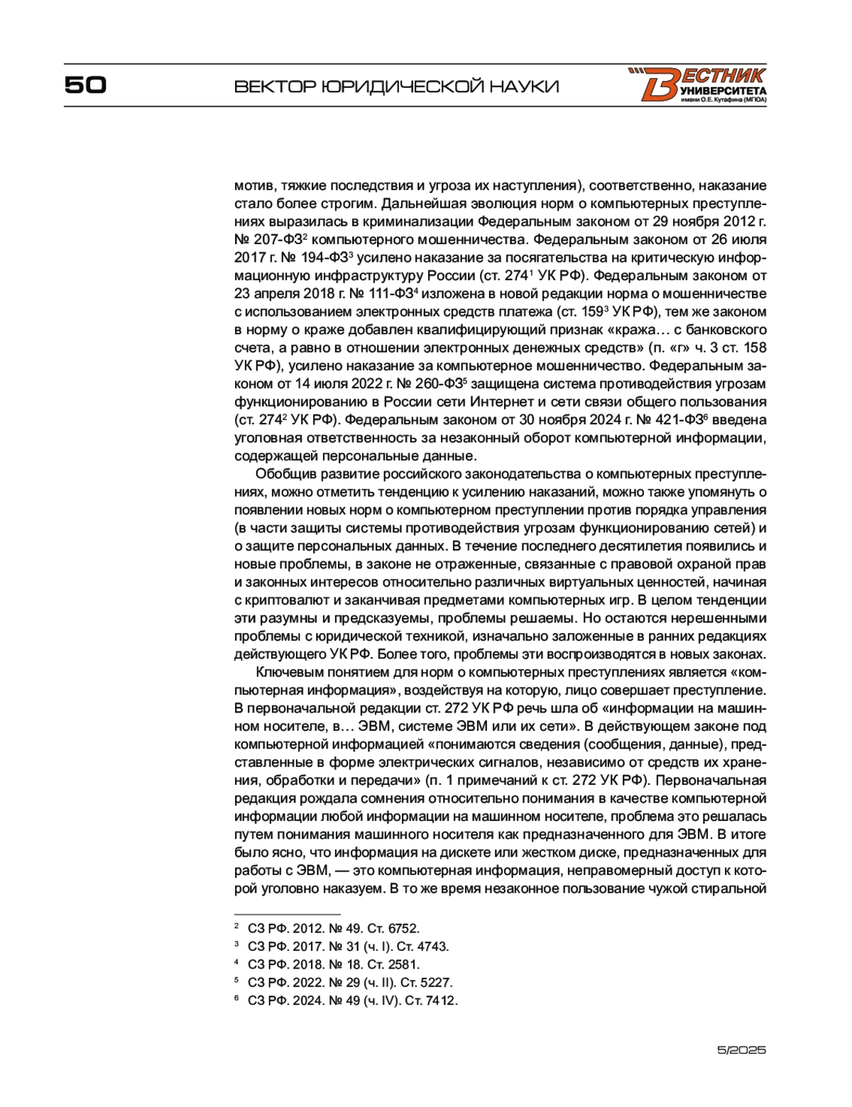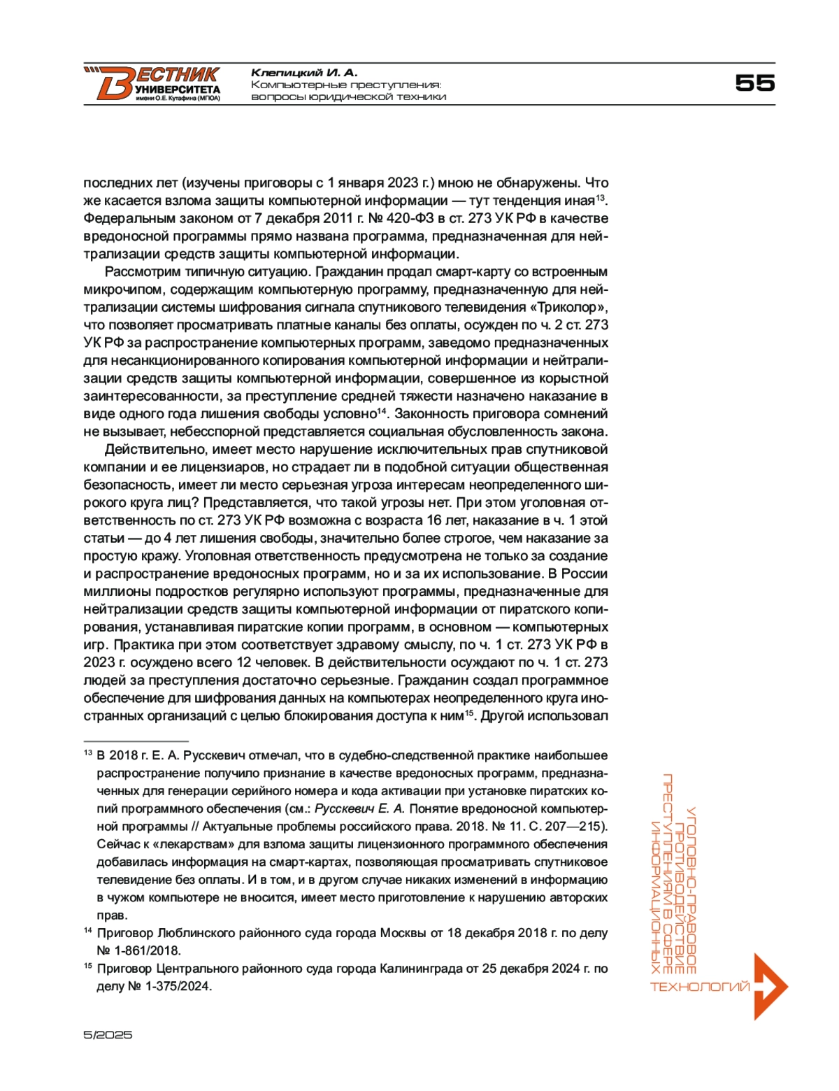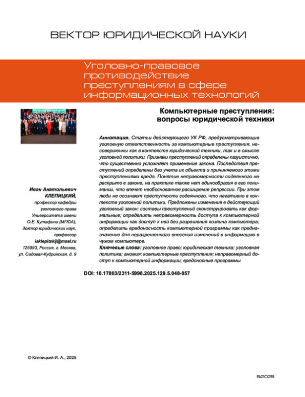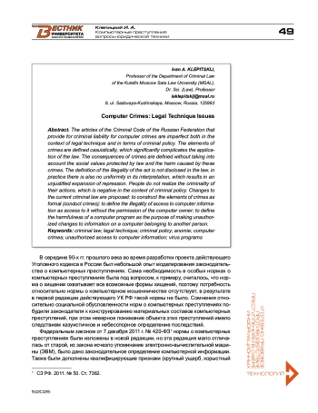1. Русскевич Е. А. Понятие вредоносной компьютерной программы // Актуальные проблемы российского права. - 2018. - № 11. - С. 207-215.