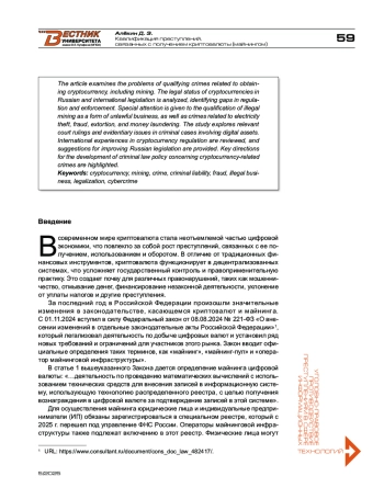 В данной статье рассматриваются проблемы квалификации преступлений, связанных с получением криптовалюты, в том числе посредством майнинга. Анализируется правовой статус криптовалют в российском законодательстве, выявляются пробелы в правовом регулировании и особенности их правоприменения. Особое внимание уделено квалификации незаконного майнинга как формы незаконного предпринимательства, а также преступлениям, связанным с хищением электроэнергии, мошенничеством, вымогательством и легализацией доходов, полученных преступным путем. Исследуются актуальные судебные решения и проблемы доказывания в уголовных делах, связанных с цифровыми активами. Выделяются ключевые направления для развития уголовно-правового регулирования в отношении преступлений, связанных с криптовалютами.