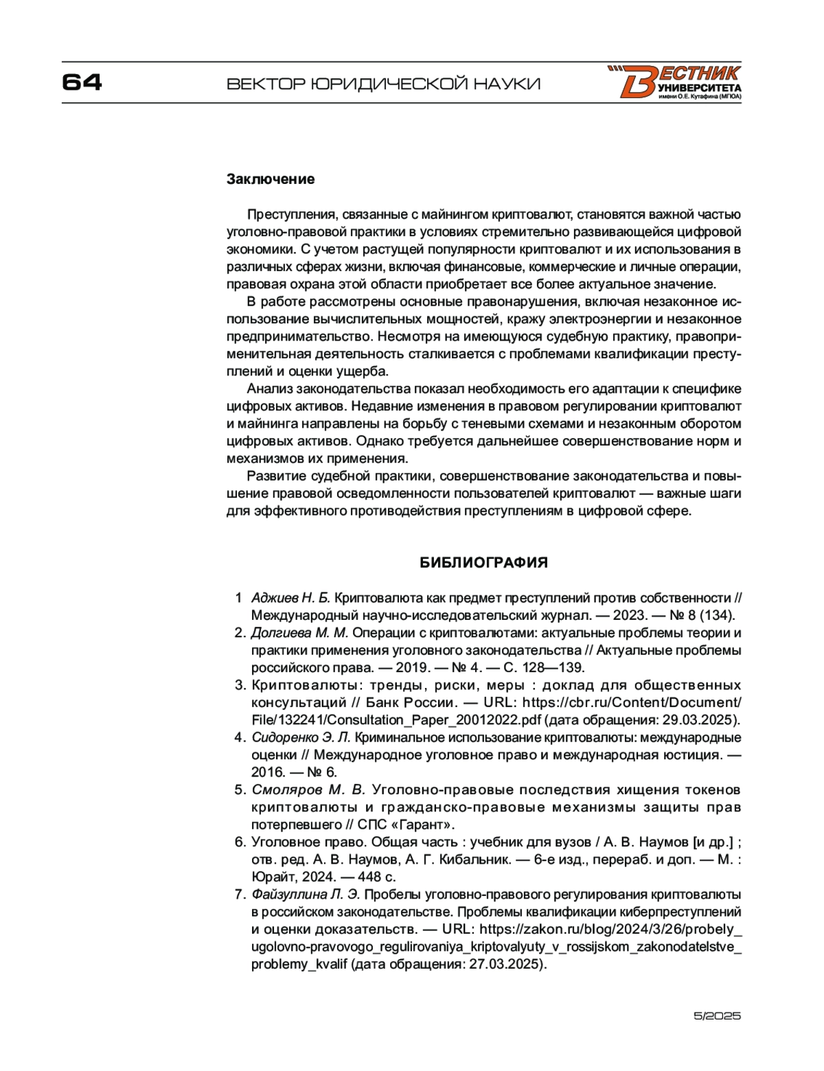 7. Файзуллина Л. Э. Пробелы уголовно-правового регулирования криптовалюты в российском законодательстве. Проблемы квалификации киберпреступлений и оценки доказательств. - URL: https://zakon.ru/blog/2024/3/26/probely_ugolovno-pravovogo_regulirovaniya_kriptovalyuty_v_rossijskom_zakonodatelstve_problemy_kvalif (дата обращения: 27.03.2025).