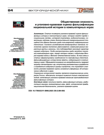 Статья посвящена уголовно-правовой оценке фальсификации истории в компьютерных играх, которые сегодня наряду с социальными сетями, интернет-порталами, видеохостингами, новостными сайтами стали дополнительной коммуникационной площадкой для обмена данными среди пользователей информационных технологий. Согласно исследованиям международных компаний, количество игроков постоянно увеличивается, охватывая разные возрастные группы и регионы, что подтверждает массовый характер игровой индустрии. Особо распространены среди молодого поколения компьютерные игры, сюжет которых связан с событиями Второй мировой войны и Великой Отечественной войны. В этой связи в статье сформулированы предложения по квалификации действий, фальсифицирующих исторические факты, содержащиеся в компьютерных играх. Обращается внимание на неопределенность правовой природы компьютерных игр, отсутствие регламентации разработки и определения содержания игровых продуктов, что порождает сложности уголовно-правовой оценки искажения информации об исторических событиях в играх.