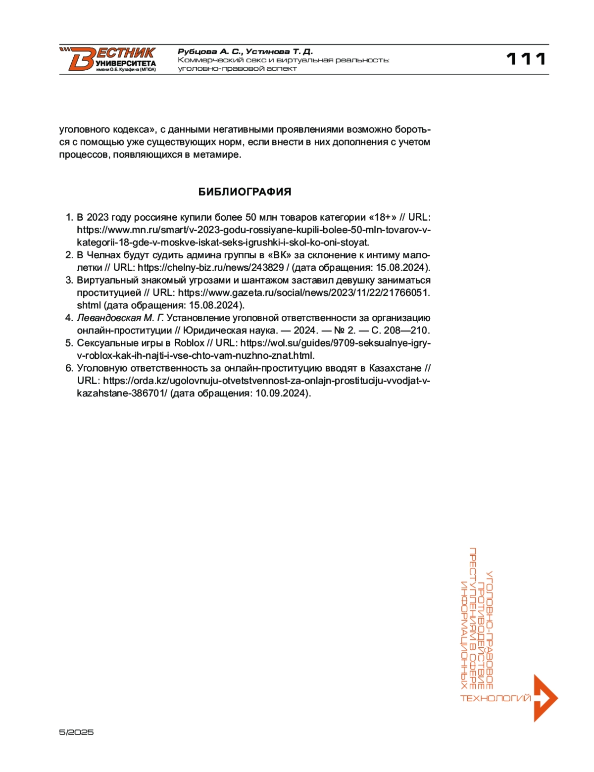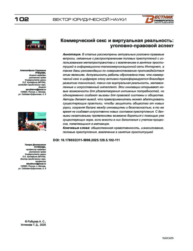 В статье рассмотрены актуальные уголовно-правовые вопросы, связанные с распространением половых преступлений с использованием метапространства и с вовлечением в занятие проституцией в информационно-телекоммуникационной сети Интернет, а также даны рекомендации по совершенствованию противодействия этим явлениям. Актуальность работы обусловлена тем, что коммерческий секс в цифровую эпоху активно трансформируется благодаря развитию технологий, таких как виртуальная реальность, метавселенные и искусственный интеллект. Эти инновации открывают новые возможности для удовлетворения интимных потребностей, но одновременно создают вызовы для правовой системы и общества. Авторы делают вывод, что правоприменитель может адаптировать существующие практики, чтобы защитить общество от новых угроз, сохраняя баланс между инновациями и безопасностью, в то же время не создавая искусственно новых составов преступления. С данными негативными проявлениями возможно бороться с помощью уже существующих норм, если внести в них дополнения с учетом процессов, появляющихся в метамире.