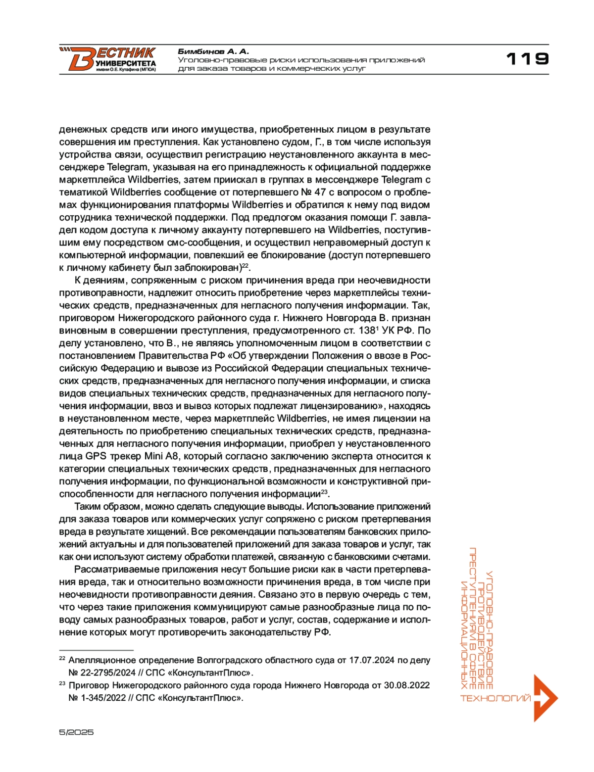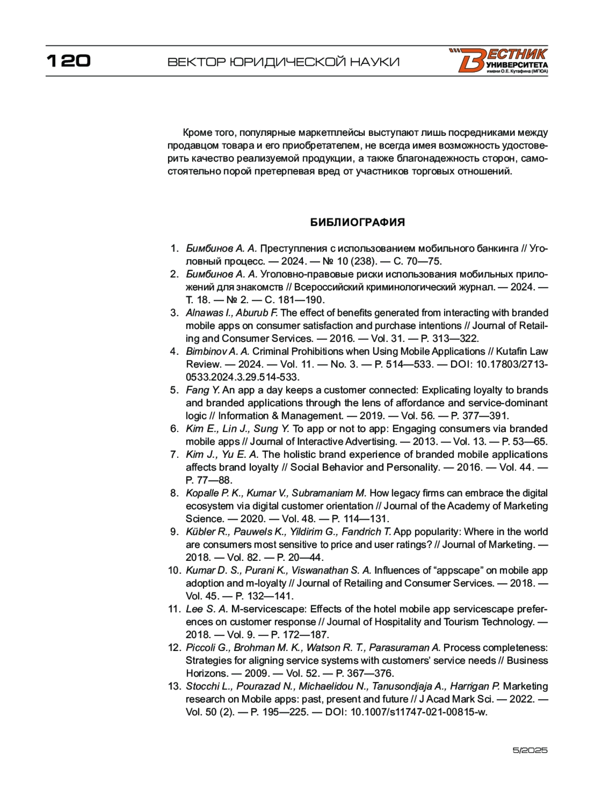 4. Bimbinov A. A. Criminal Prohibitions when Using Mobile Applications // Kutafin Law Review. - 2024. - Vol. 11. - No. 3. - P. 514-533. - https://doi.org/10.17803/2713-0533.2024.3.29.514-533.