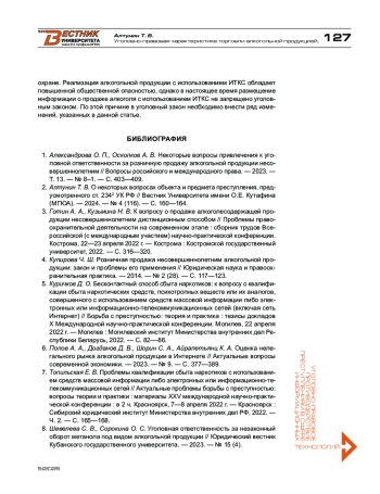 3. Готин А. А., Кузьмина Н. В. К вопросу о продаже алкоголесодержащей продукции несовершеннолетним дистанционным способом // Проблемы правоохранительной деятельности на современном этапе: сборник трудов Всероссийской (с международным участием) научно-практической конференции. Кострома, 22-23 апреля 2022 г. - Кострома: Костромской государственный университет, 2022. - С. 316-320.