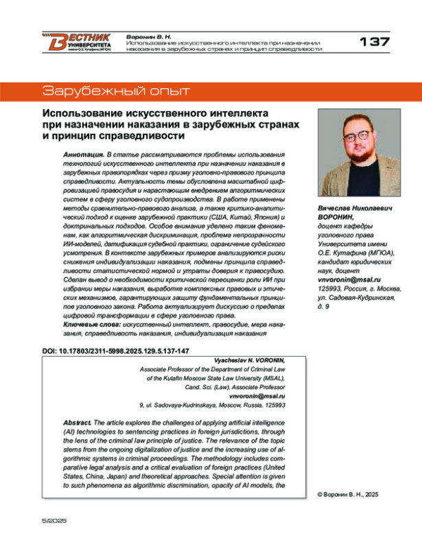 В статье рассматриваются проблемы использования технологий искусственного интеллекта при назначении наказания в зарубежных правопорядках через призму уголовно-правового принципа справедливости. Актуальность темы обусловлена масштабной цифровизацией правосудия и нарастающим внедрением алгоритмических систем в сферу уголовного судопроизводства. В работе применены методы сравнительно-правового анализа, а также критико-аналитический подход к оценке зарубежной практики (США, Китай, Япония) и доктринальных подходов. Особое внимание уделено таким феноменам, как алгоритмическая дискриминация, проблема непрозрачности ИИ-моделей, датификация судебной практики, ограничение судейского усмотрения. В контексте зарубежных примеров анализируются риски снижения индивидуализации наказания, подмены принципа справедливости статистической нормой и утраты доверия к правосудию. Сделан вывод о необходимости критической переоценки роли ИИ при избрании меры наказания, выработке комплексных правовых и этических механизмов, гарантирующих защиту фундаментальных принципов уголовного закона. Работа актуализирует дискуссию о пределах цифровой трансформации в сфере уголовного права.