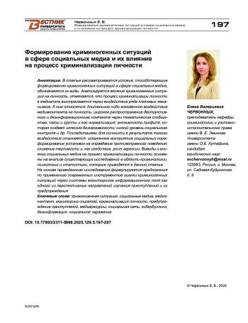 В статье рассматриваются условия, способствующие формированию криминогенных ситуаций в сфере социальных медиа, обозначаются их виды. Анализируется влияние криминогенных ситуаций на личность, отмечается, что процесс криминализации личности в медиаполе выстраивается через воздействие ряда ключевых механизмов. К ним относятся: длительное либо мгновенное воздействие медиаконтента на личность; широкое распространение деструктивного и дезинформационного контента через тематические сообщества, чаты и группы и его нормализация; анонимность профиля, которая создает иллюзию безнаказанности; низкий уровень социального контроля и др. Последствиями для личности в результате такого воздействия становятся: искаженное восприятие социальных норм; формирование установок на оправдание противоправного поведения; снижение терпимости и, как следствие, рост агрессии. Выводы о влиянии социальных медиа на процесс криминализации личности основаны на анализе существующих исследований в области криминологии, психологии и статистики, которые приводятся в данной статье. На основе проведенного исследования формулируются предложения по применению современных инструментов оценки криминогенных ситуаций через системы мониторинга информационного поля как одного из перспективных направлений изучения преступлений и их предупреждения.