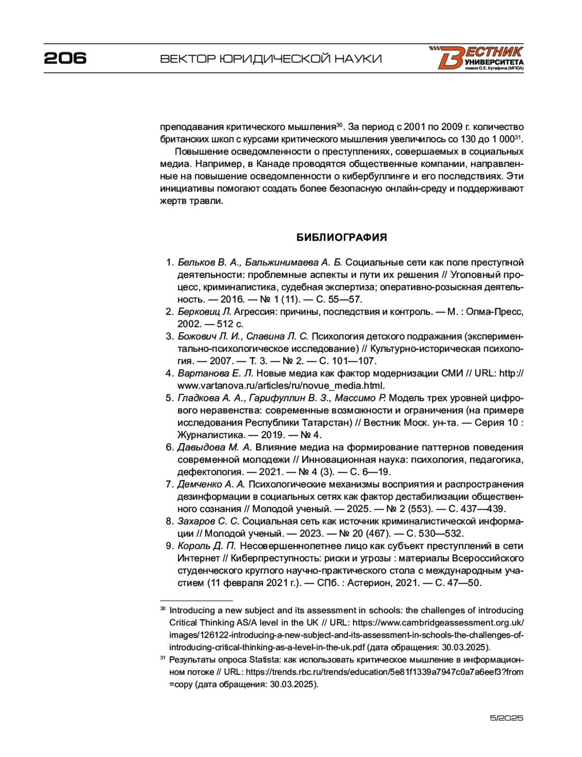 1. Бельков В. А., Бальжинимаева А. Б. Социальные сети как поле преступной деятельности: проблемные аспекты и пути их решения // Уголовный процесс, криминалистика, судебная экспертиза; оперативно-розыскная деятельность. - 2016. - № 1 (11). - С. 55-57.