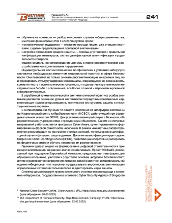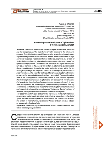В работе приведены зарубежный и отечественный опыт реализации программ и проектов, направленных на виктимологическую профилактику в цифровом пространстве, так как международный опыт представляет ценность для формирования эффективной системы виктимологической профилактики в России и может служить основой для сравнительно-правового анализа.