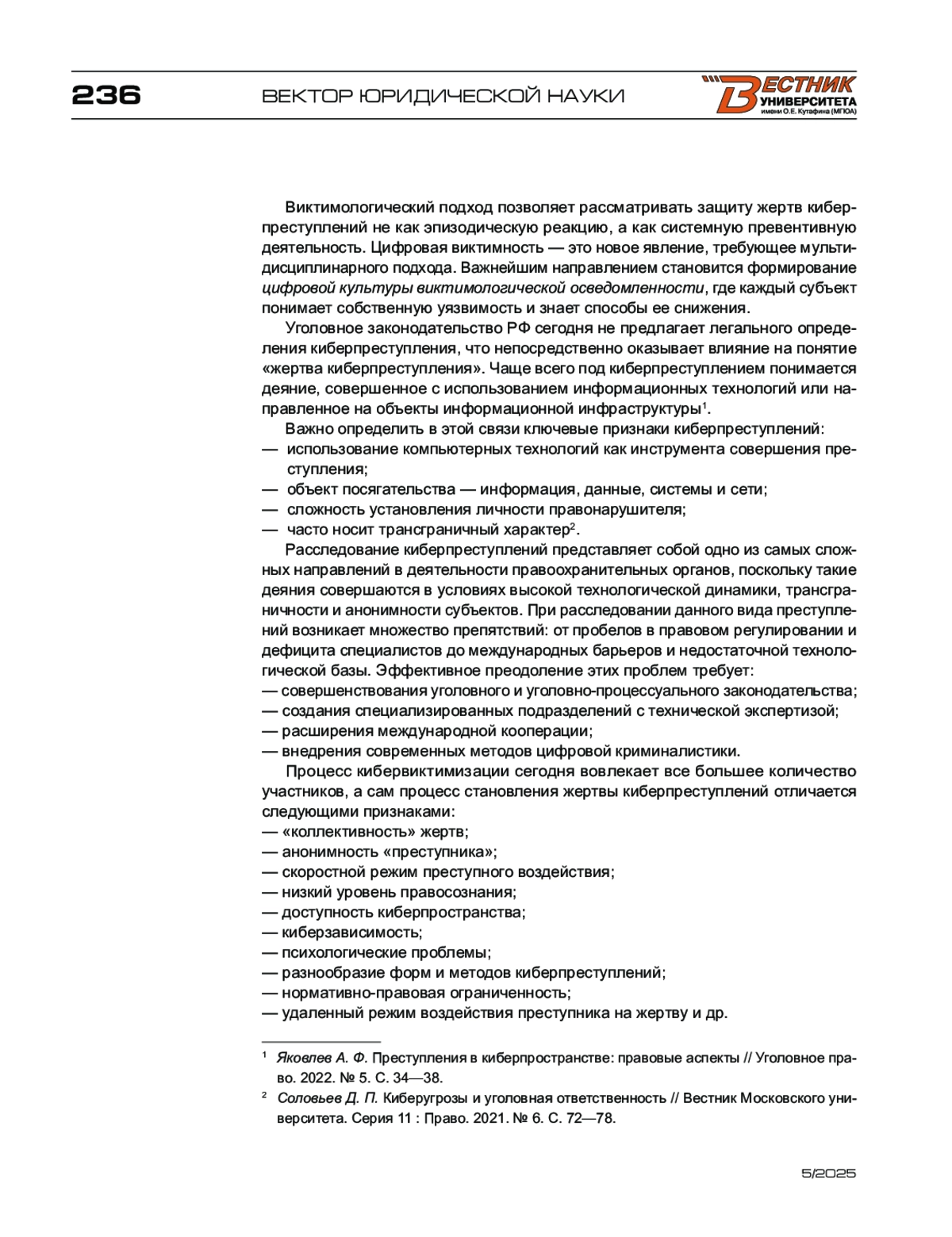 6. Яковлев А. Ф. Преступления в киберпространстве: правовые аспекты // Уголовное право. - 2022. - № 5. - С. 34-38.