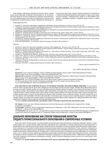 5. Дудырев Ф.Ф., Романова О.А., Шабалин А.И. Дуальное обучение в российских регионах: модели, лучшие практики, возможности распространения. Вопросы образования. 2018; № 2: 117-138.