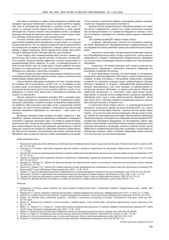 1. Рядинская И.А. Дуальная система обучения как способ подготовки квалифицированных кадров и трудоустройства молодежи. Педагогическая наука и практика. 2020; № 1 (27): 100-102. EDN: ZMPBBI