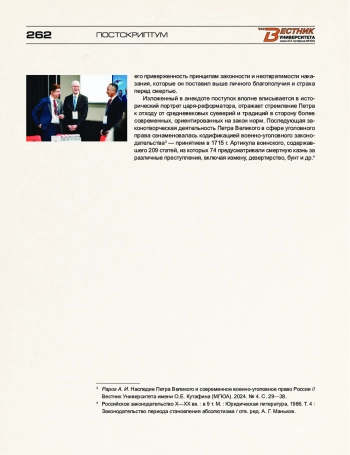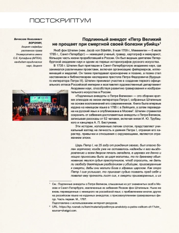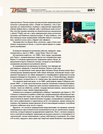 Для цитирования: Воронин В. Н. Подлинный анекдот «Петр Великий не прощает при смертной своей болезни убийц». Вестник Университета имени О. Е. Кутафина (МГЮА). 2025;(5):260-262.