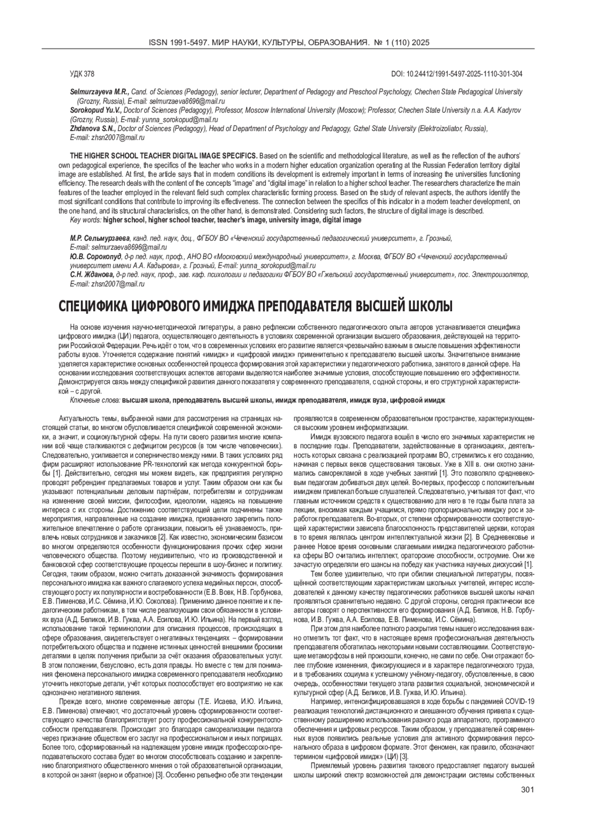 3. Горбунова Н.В., Вовк Е.В. Особенности цифрового имиджа педагога высшей школы. Мир науки, культуры, образования. 2023; № 2 (99): 302-305. EDN: JPMVAA