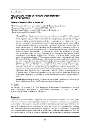 Современное российское общество сталкивается с множеством новых вызовов в области здравоохранения, таких как появление новых заболеваний, увеличение продолжительности жизни и рост числа хронических заболеваний. Все это требует нового подхода к формированию медицинской грамотности населения. Большой объем информации о здоровье и медицине определяет значимость важно обучения населения критическому мышлению и способности отличать достоверную информацию от недостоверной. Задачи по формированию у населения ответственного отношения к своему здоровью и здоровью окружающих, привитию навыков здорового образа жизни, развитию культуры здоровья приводят к необходимости поиска эффективных способов их достижения, одним из которых, по мнению авторов, является медицинское просвещение. Методология, методы и методики исследования базировались на системных и кластерных подходах как ключевых, основополагающих подходов медицинского просвещения в российском современном обществе. В работе представлена авторская педагогическая модель медицинского просвещения населения, включающая целевой, содержательный и результативный блоки. В целевом блоке модели определены цели, подходы и принципы в соответствии с базовым понятием. Дается описание функций, задач, каналов и направлений медицинского просвещения, которые были размещены в содержательном блоке модели. Исследователями выделены и описаны критерии и уровни сформированности медицинской грамотности населения. В модели также представлены этапы просветительской работы с населением и организационно-педагогические условия. Разработанная педагогическая модель медицинского просвещения населения может быть реализована как в практике подготовки специалистов медицинской сферы к медицинской просветительской деятельности, так в рамках совершенствуя профессиональных компетенций специалистов социального и гуманитарного профиля профессиональной деятельности.