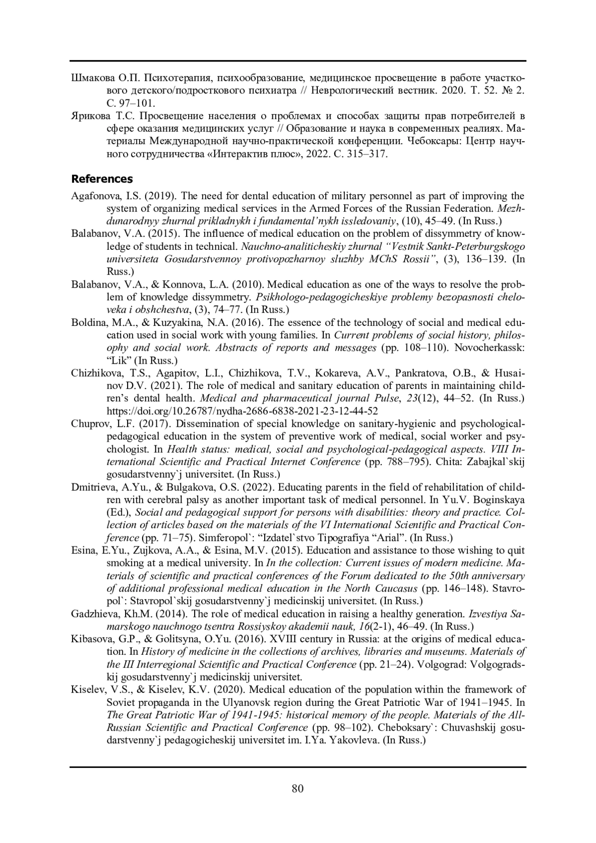 11. Князева А.М. Крючкова А.В., Кондусова Ю.В., Семынина Н.М., Полетаева И.А. Санитарное просвещение - неотъемлемая часть работы медицинского работника // Электронный научный журнал. 2016. № 2 (5). С. 60-65.